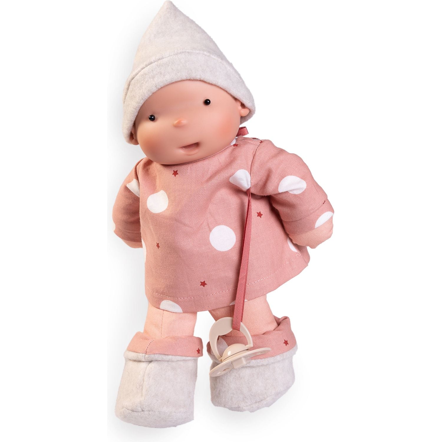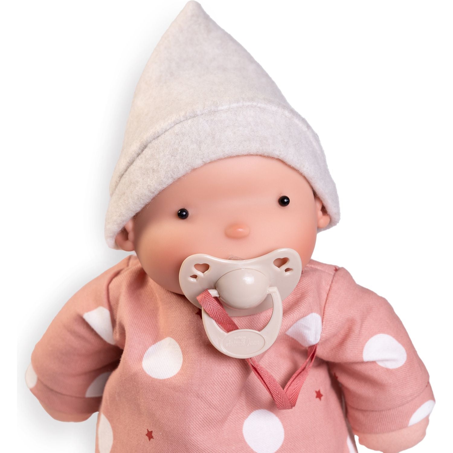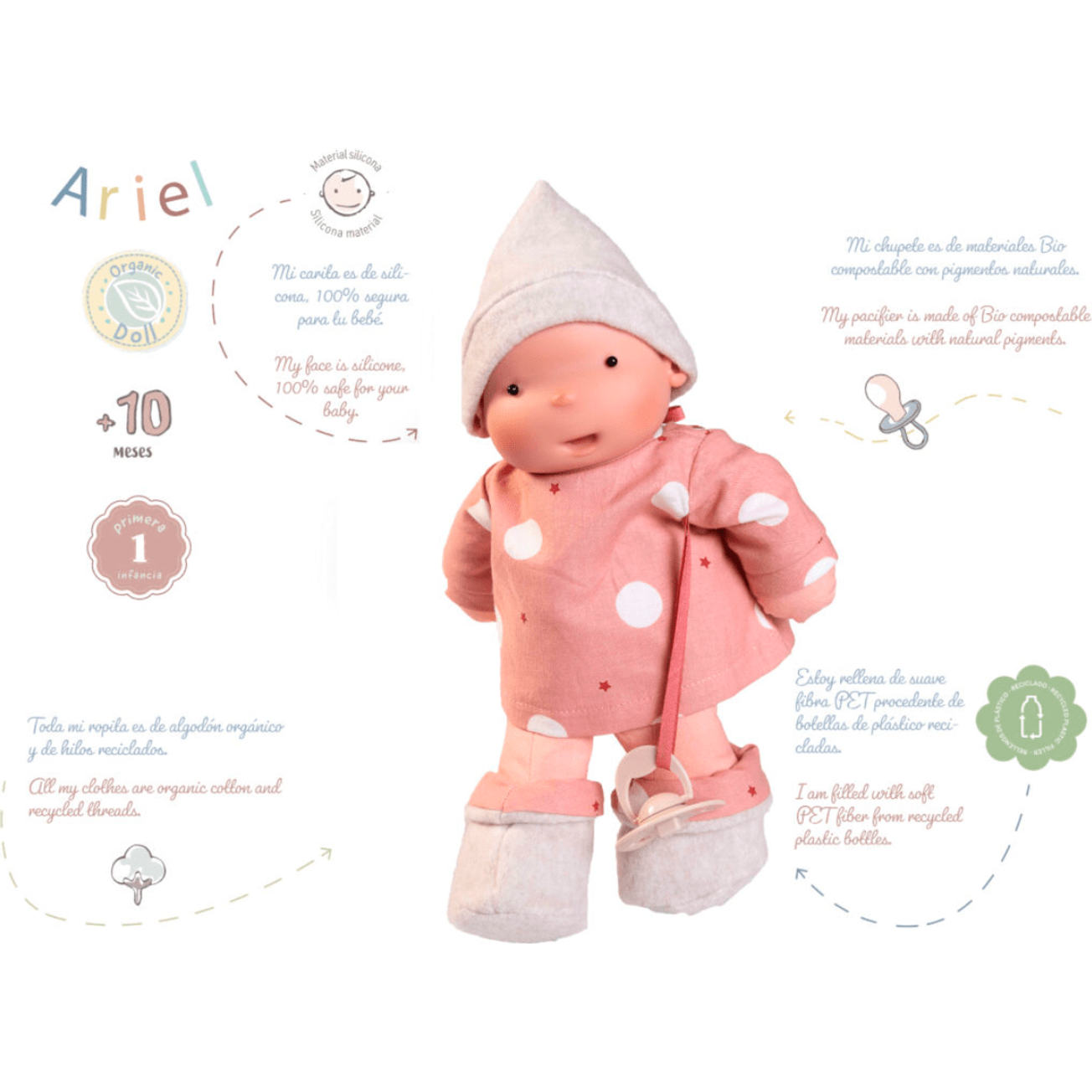 It is the perfect doll to accompany the little ones in the house on their first adventures safely and with all the quality guarantees, developed by Muñecas Antonio Juan. His body and limbs are made with organic fabrics, and a sweet little face made of 100% silicone, to stimulate his development and imagination. As part of our commitment to children, in each of our collections we try to make small changes that contribute to a better and more sustainable world. That is why we promote the use of recycled materials of natural origin in each of our dolls. His clothes are made of organic cotton and recycled threads, the pacifier is made of bio-organic materials with natural pigments and is filled with soft PET fiber from recycled plastic bottles. Orange Ariel wears a pretty dress and a hat that makes her a very funny face. Recommended for boys and girls from 10 months.