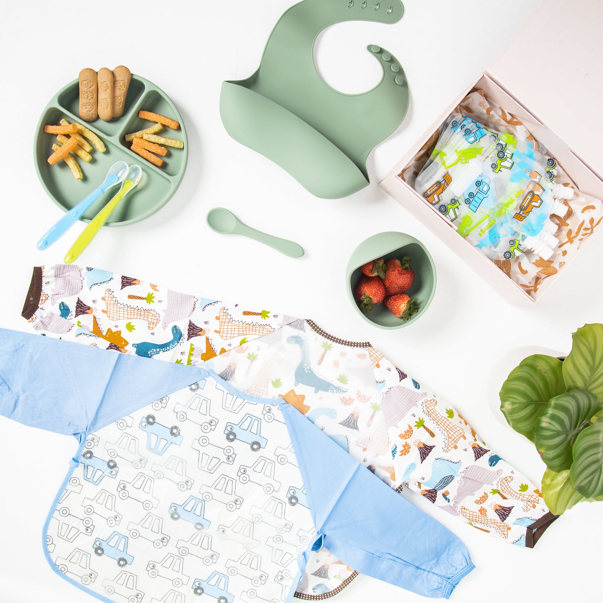 Explore the animal kingdom with our animalia smock. The waterproof mid-section, reversible pouch, and captivating animal print make mealtime an exciting adventure for your little explorer.