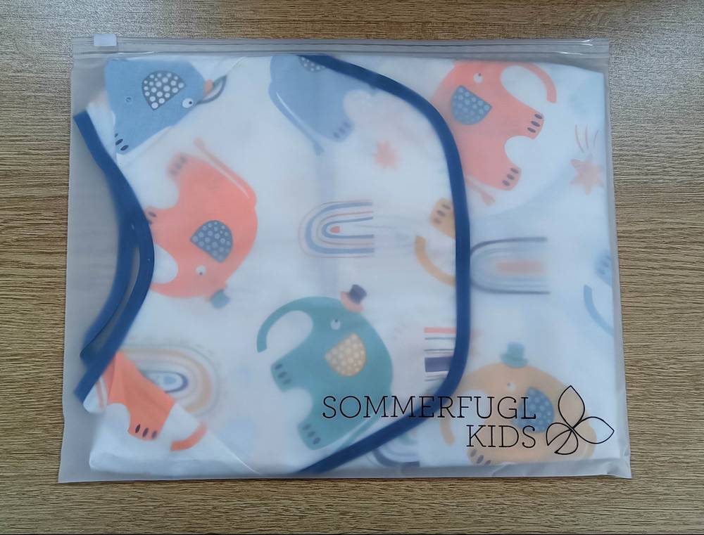 Step into the circus with our circus elephants smock. The waterproof mid-section, reversible pouch, and charming circus elephant print make mealtime a whimsical delight for your little one.