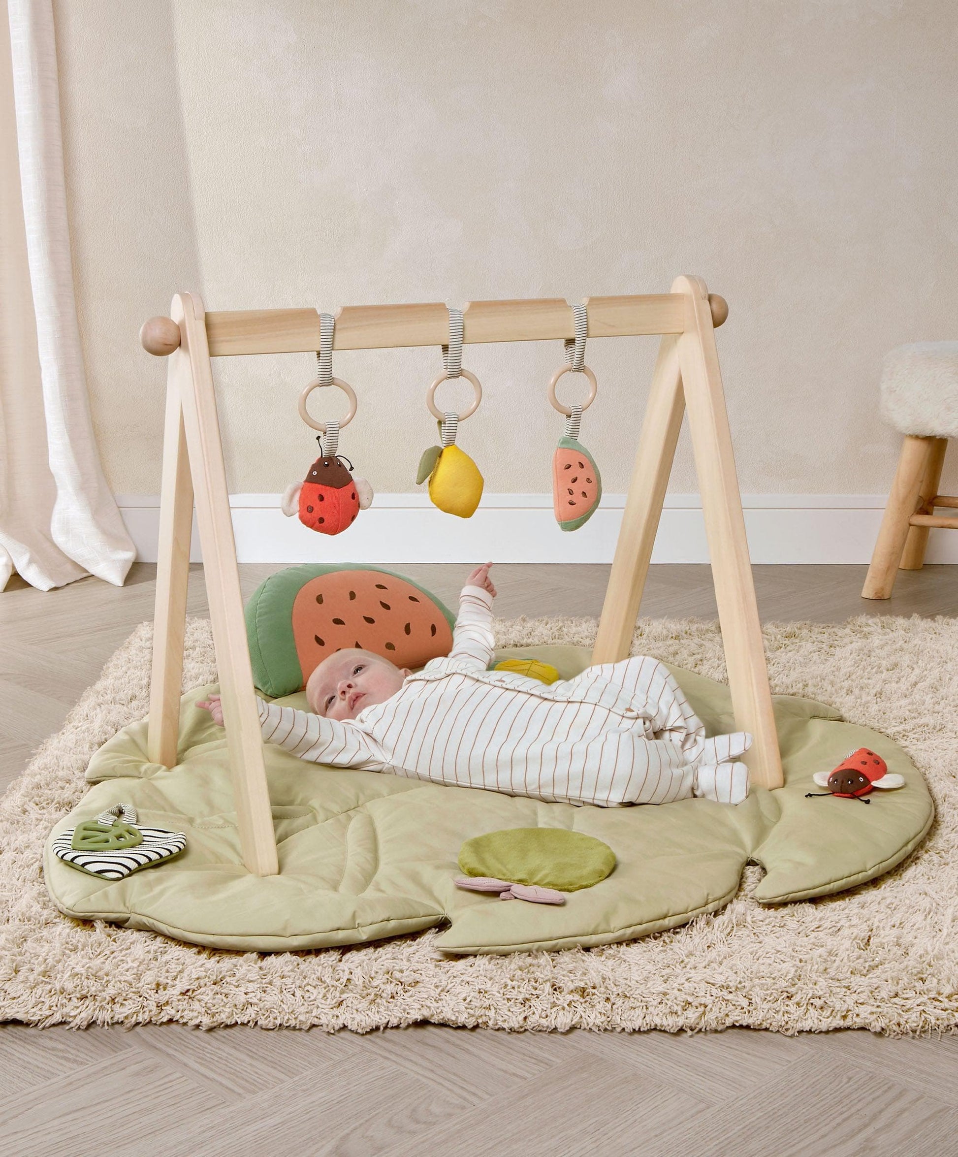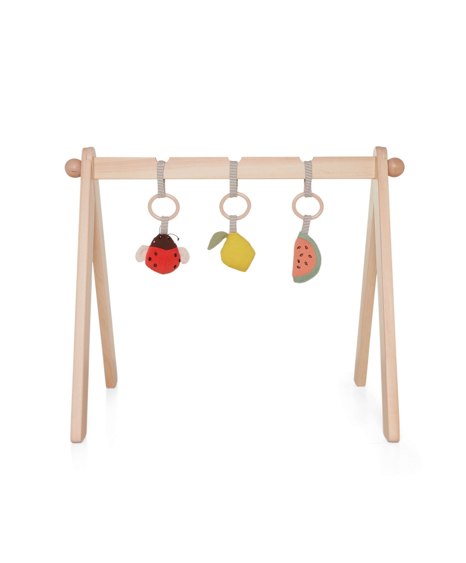 Stylish, sweet, and full of charm, our play arch is sure to captivate your little one with its trio of friendly characters – watermelon, lemon, and ladybird. Hanging from a sturdy wooden arch, the safari-themed toys feature delightful surprises like squeaks, chimes, and crinkles to stimulate baby’s senses and encourage grasping and engagement. With convenient C-ring attachments, toys can easily be detached and swapped.
