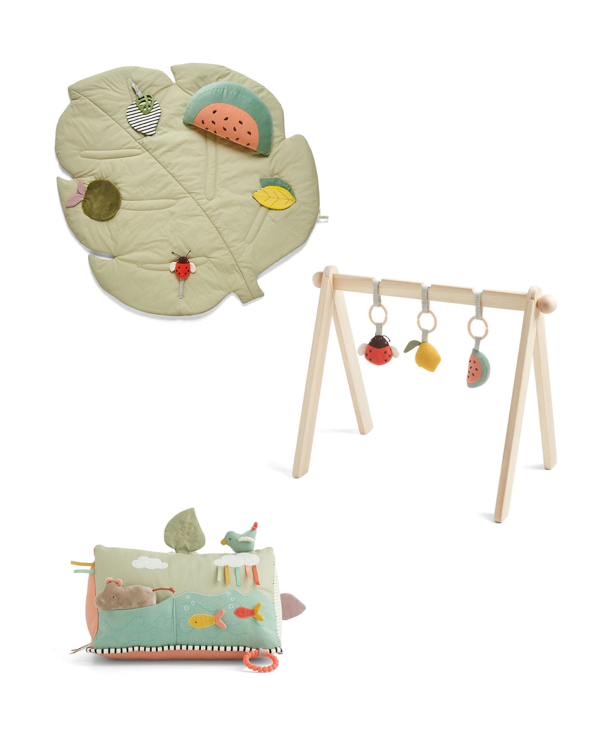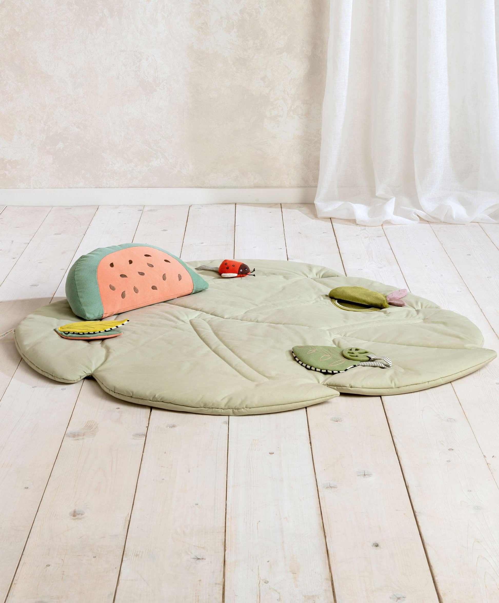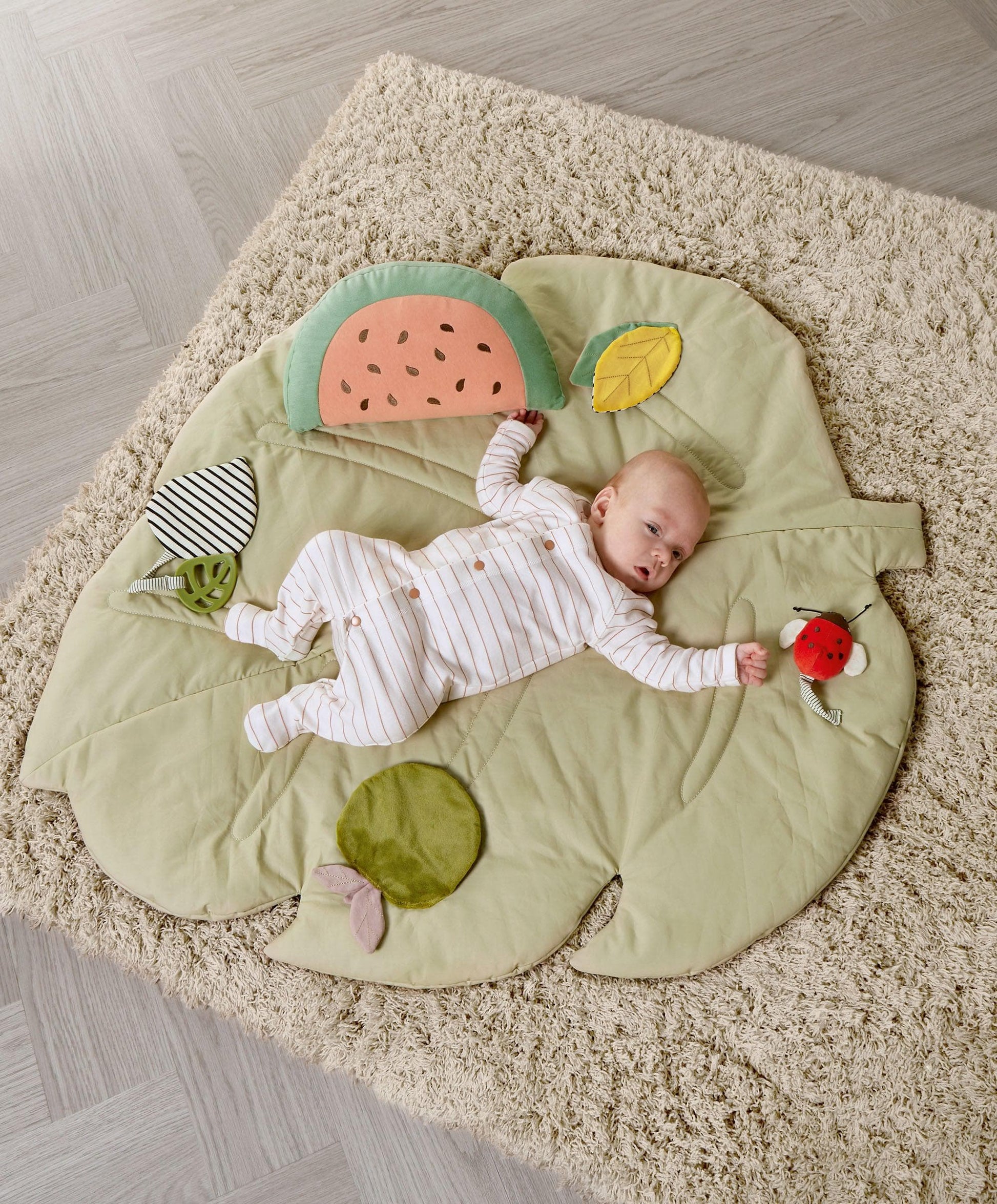 Let your little one’s imagination run wild with our safari-themed baby play mat. Shaped like a plush jungle leaf, this soft, cosy mat is perfect for tummy time fun or some supervised rest and relaxation. With tactile fabrics, crinkles, rattles, and squeakers to explore, baby will love discovering a world of sounds and textures. The deliciously cute watermelon cushion helps with their tummy time, while the handy teether provides comfort when they need some soothing downtime.