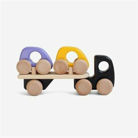 Your little one will love loading and unloading their mini cars and transporting them around the nursery! The adorable little black cab carries a removable flatbed that holds two Mini Cars (one lavender, one yellow). Expertly crafted from eco-certified solid hardwood from renewable sources and painted with non-toxic child-safe paints.