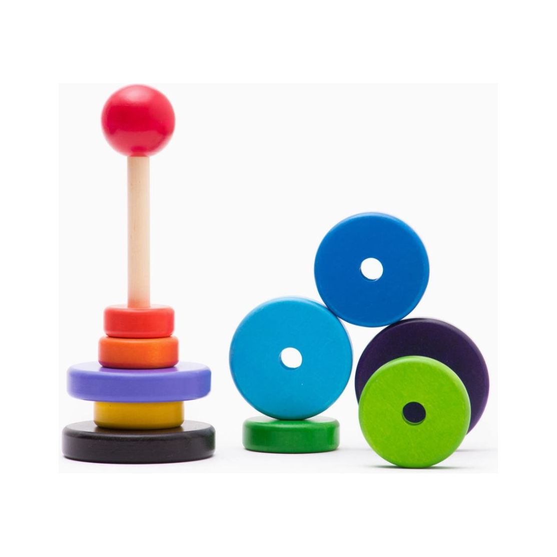 The wooden stacker with its rings arranged based on the idea of contrast is a great toy for children to play with. The bright colors of the rings are not arranged from the brightest to the darkest, but rather in a way that enhances the contrast between the different colors. Stacking the rings on the wooden stacker is a wonderful way for children to exercise their hand-eye coordination. The pyramid is an essential toy for helping even the smallest children develop their fine and gross motor skills. It is also a great way for children to learn about colors and shapes as they play. Made from high-quality, sustainably sourced wood, the wooden stacker is built to last and can withstand the wear and tear of regular play. The non-toxic, child-safe paint used on the rings ensures that they are safe for children to handle and play with.