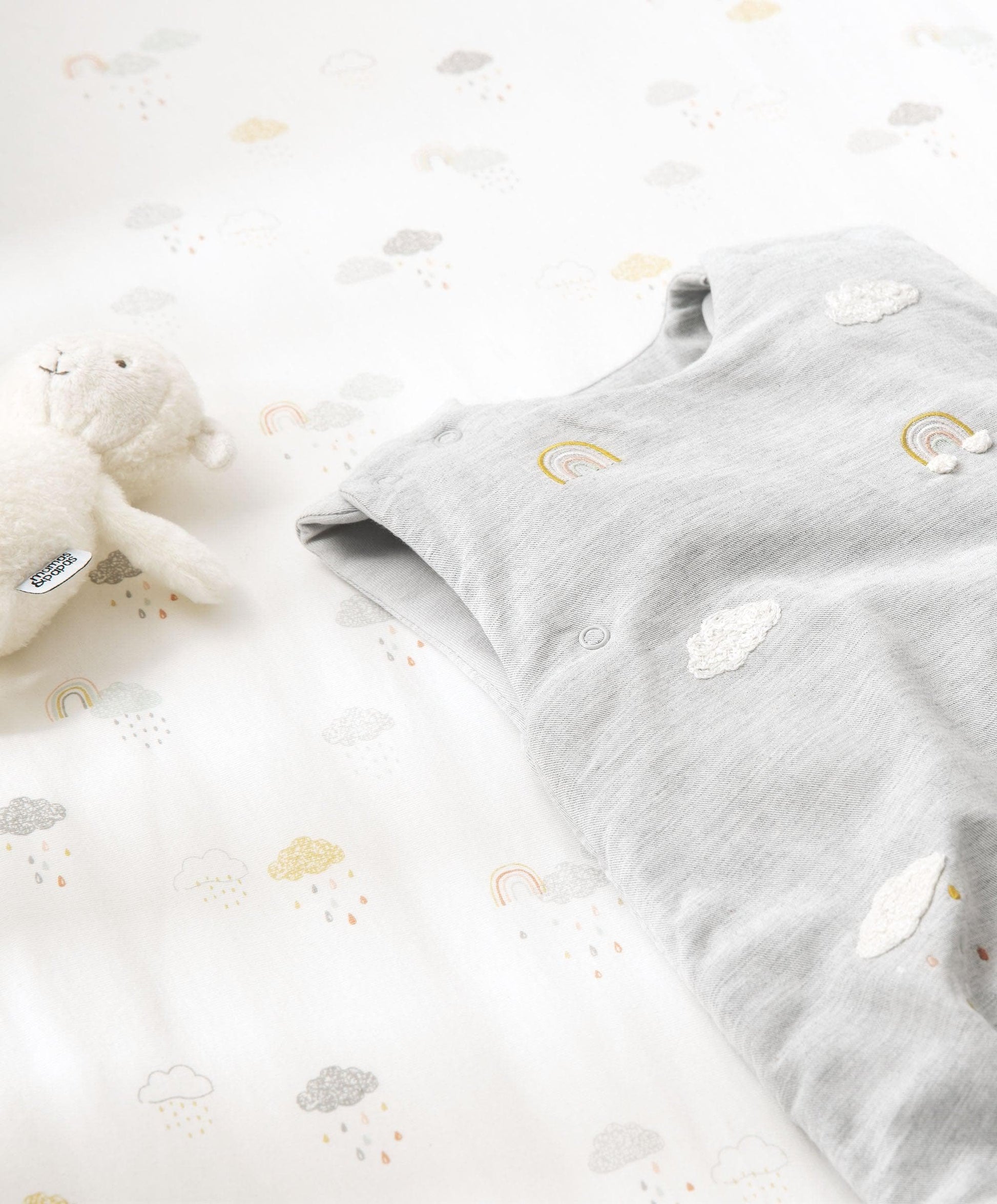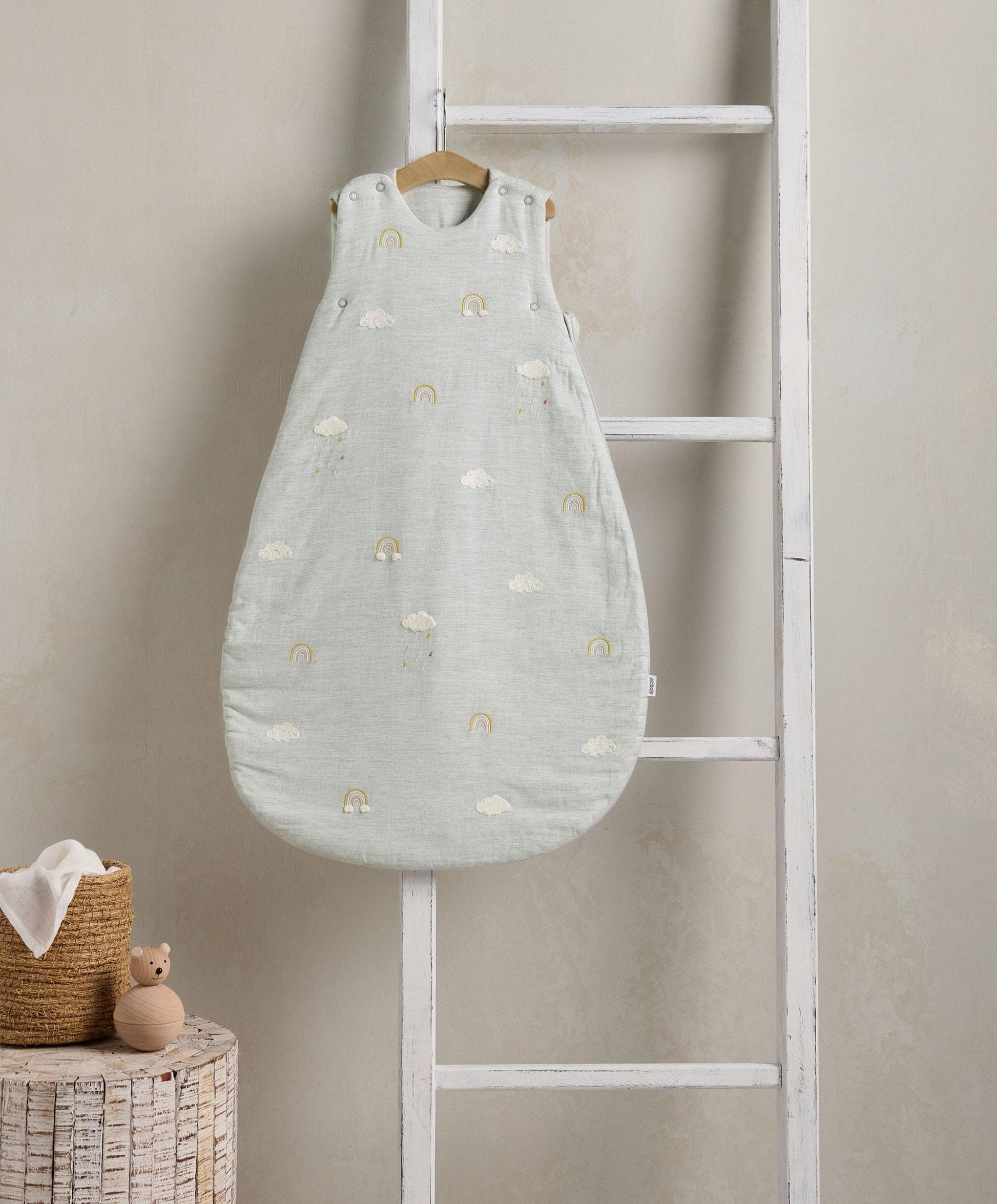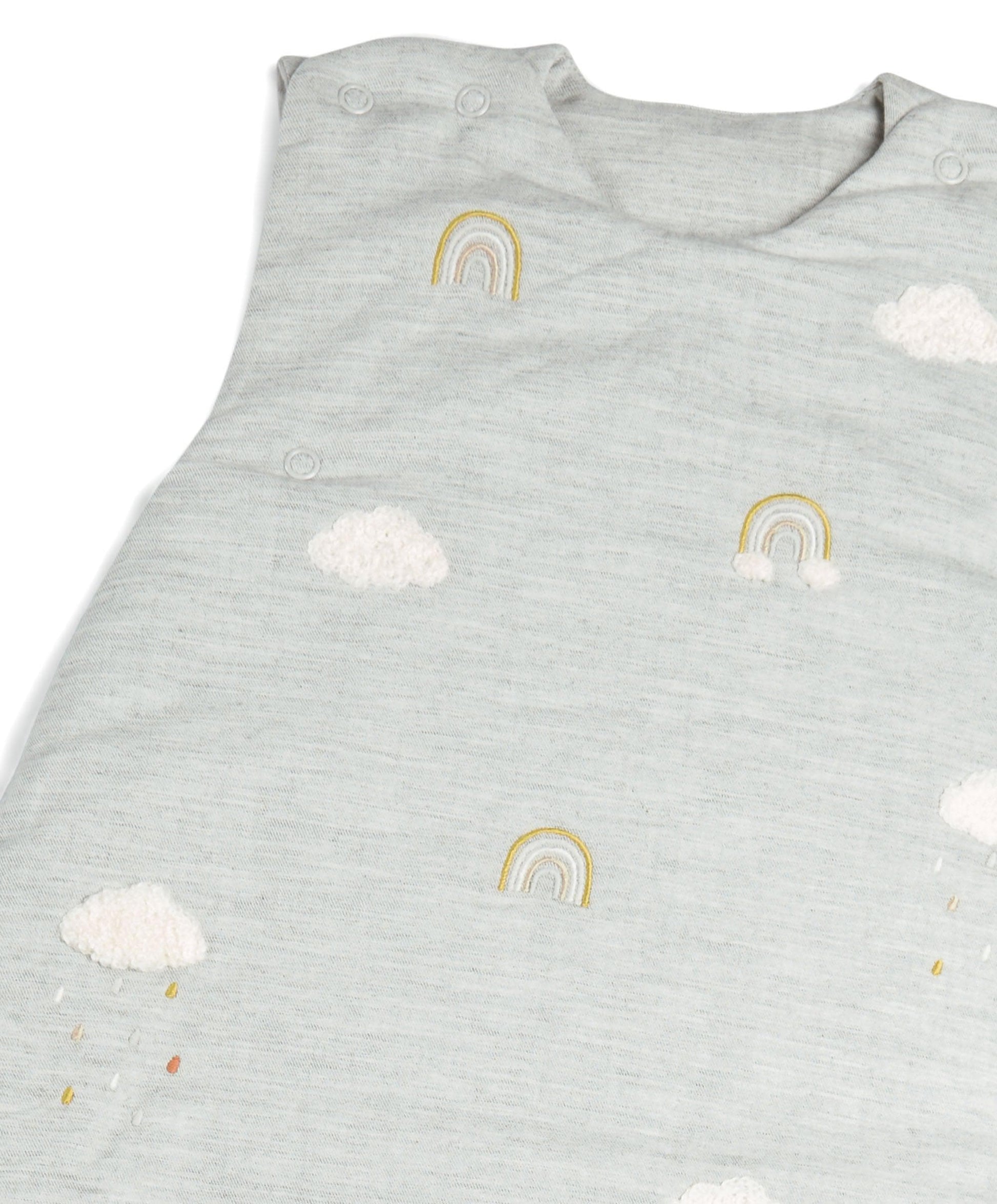 Unisex 2.5 tog dreampod suitable for 0-6months. Made from super-soft cotton that’s gentle on their skin and breathable, to encourage a healthy sleep. Features delicate cloud and rainbow print. Shoulder popper opening and zip opening.