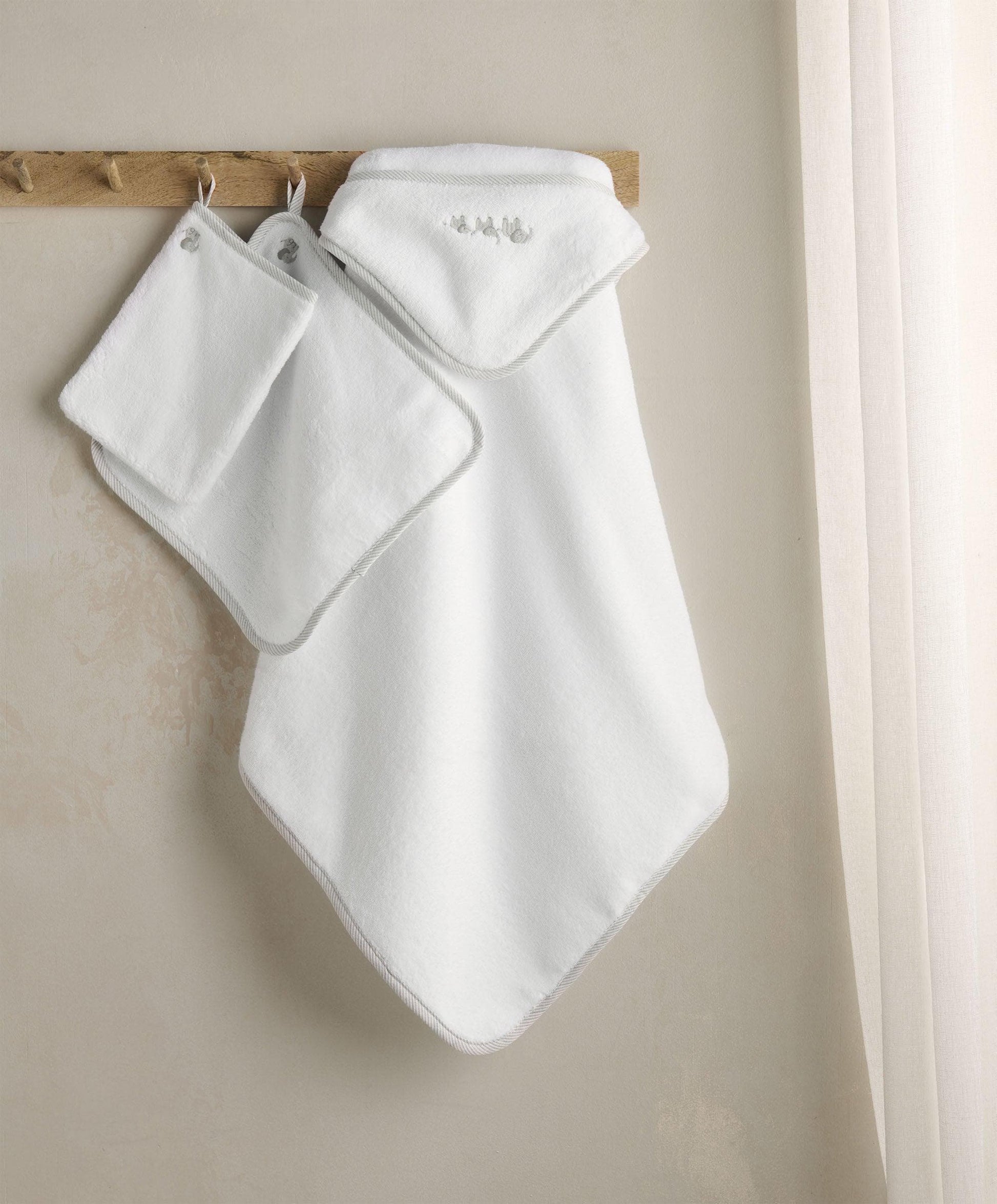 3-piece bath set, includes face, hand and bath towel. Crafted from super-soft cotton. Finished with classic striped details and binding, with cute elephant embroidery.