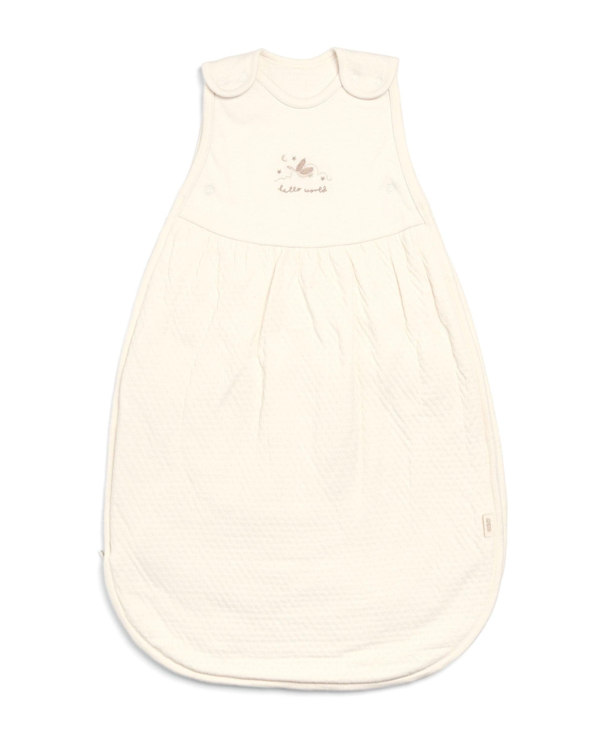 2.5 Tog dreampod, suitable from birth. Made from super soft 2.5 Tog jersey pointelle fabric, in off-white with signature flying duck embroidery. With shoulder popper openings and bottom zip opening for easy changing. Find the perfect fit even as baby grows, with poppers below arm openings. Made from ultrasoft cotton. Suitable for 0-6 months.