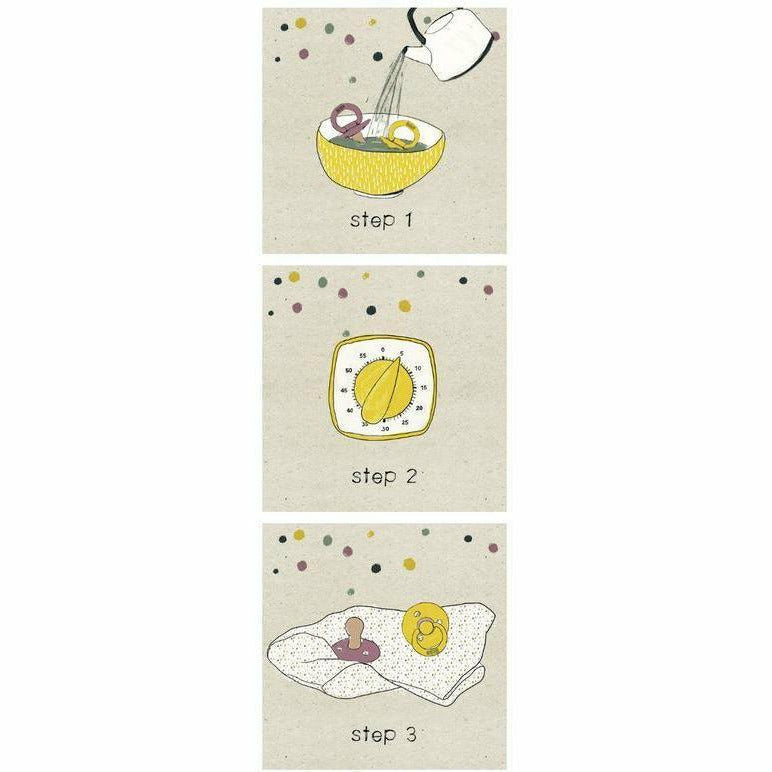 Sterilize each pacifier before use. Bring water to a boil and pour boiling water over pacifiers. Let the pacifiers soak for approx. 5 minutes. Pick them up and let them dry. The pacifier nipples may retain water, simply squeeze the nipple to release and lay to cool and dry for 3-4 hours. If the pacifier shows any irregularities, we recommend that you discard right away. Due to our pacifiers being made with natural rubber, the nipple may expand with use.