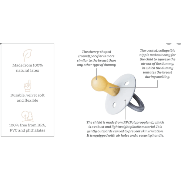 BIBS pacifiers are made in Denmark and have been a favorite for both moms and babies for over forty years, the BIBS natural rubber baby pacifier allows your child to self-soothe by exercising their instinctive sucking instinct in the most natural way possible, by mimicking both the shape and soft materials of mothers’ breast. Their classic appearance captures a look that’s both timeless and elegant. All BIBS pacifiers are made from 100% natural latex and are lead and pthalate free.