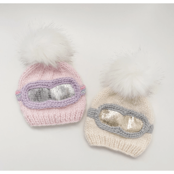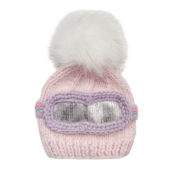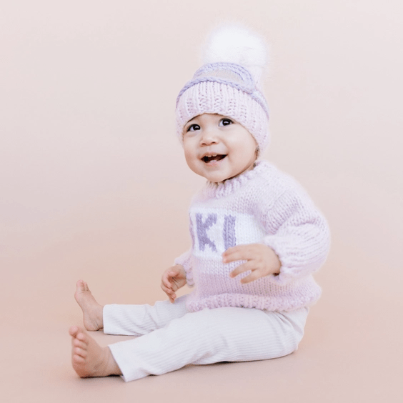 The perfect beanie for little skiers, and non-skiers alike. Our Pink ski hat featuring a Lavender, Sky Blue, and Pink goggle band is the perfect blend of warmth, comfort, and style, while the pom-pom and gold metallic details add dimension and design to this epic beanie. Pair with a Cream or Bowie Grey Classic Cardigan or Pink Ski Sweater for a complete look. Final design may vary slightly from the pictured mockup.