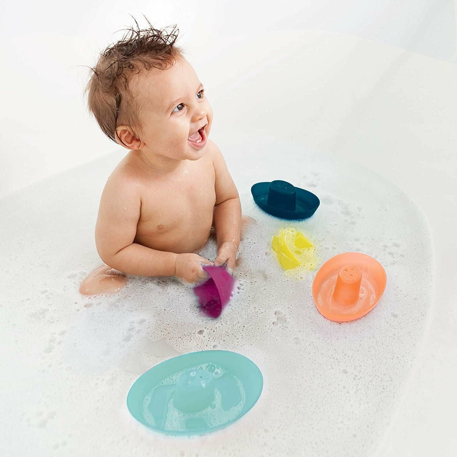 Boon Fleet Stacking Boats are the ultimate bathtime toy, much better than your favorite food storage containers! They include a wide deck for scooping and pouring water, drain holes for creating a rain effect, plus they're BPA- Phthalate, and PVC-free.