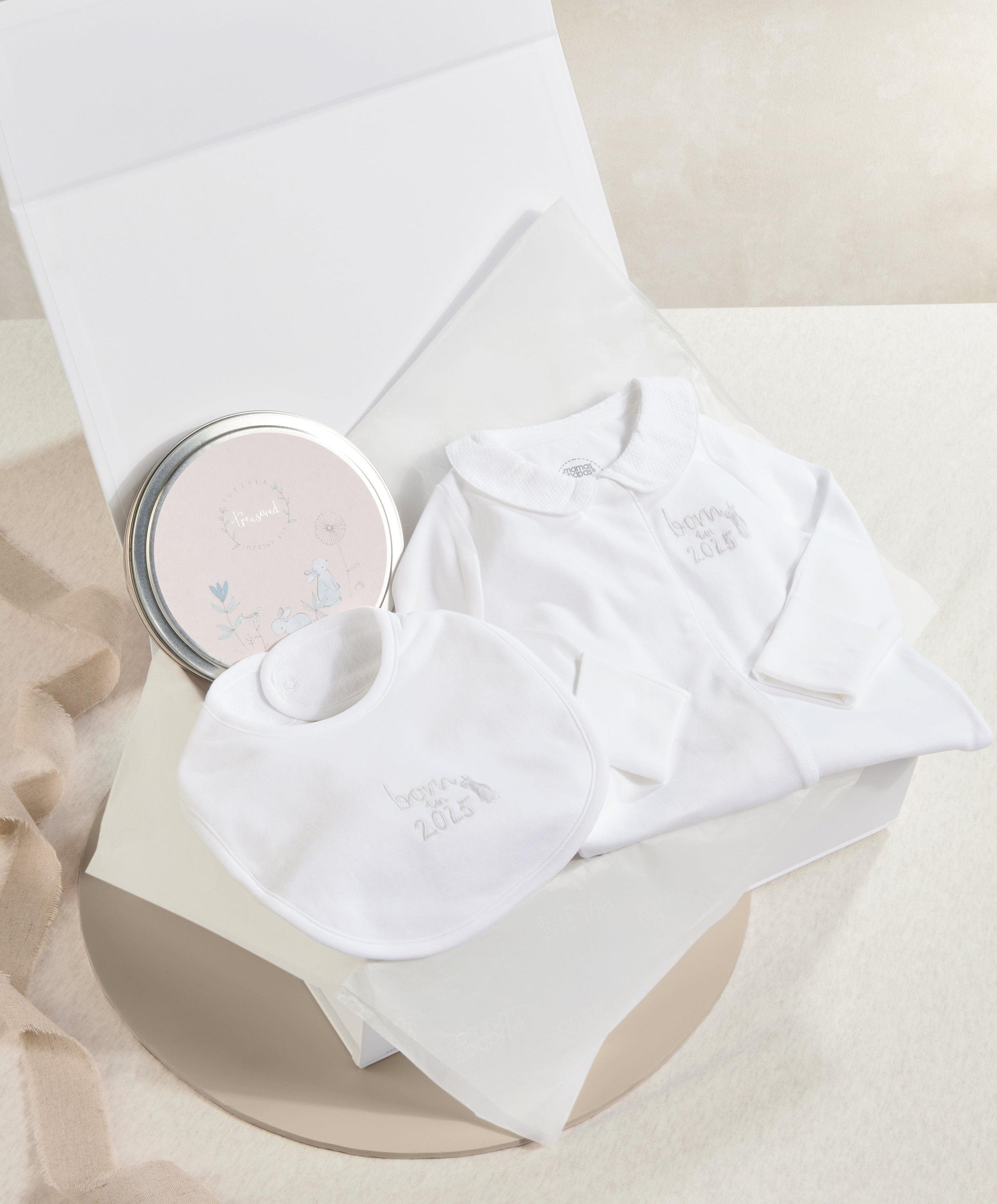 This born in 2025 all in one, with cotton woven collar makes the perfect newborn gift.