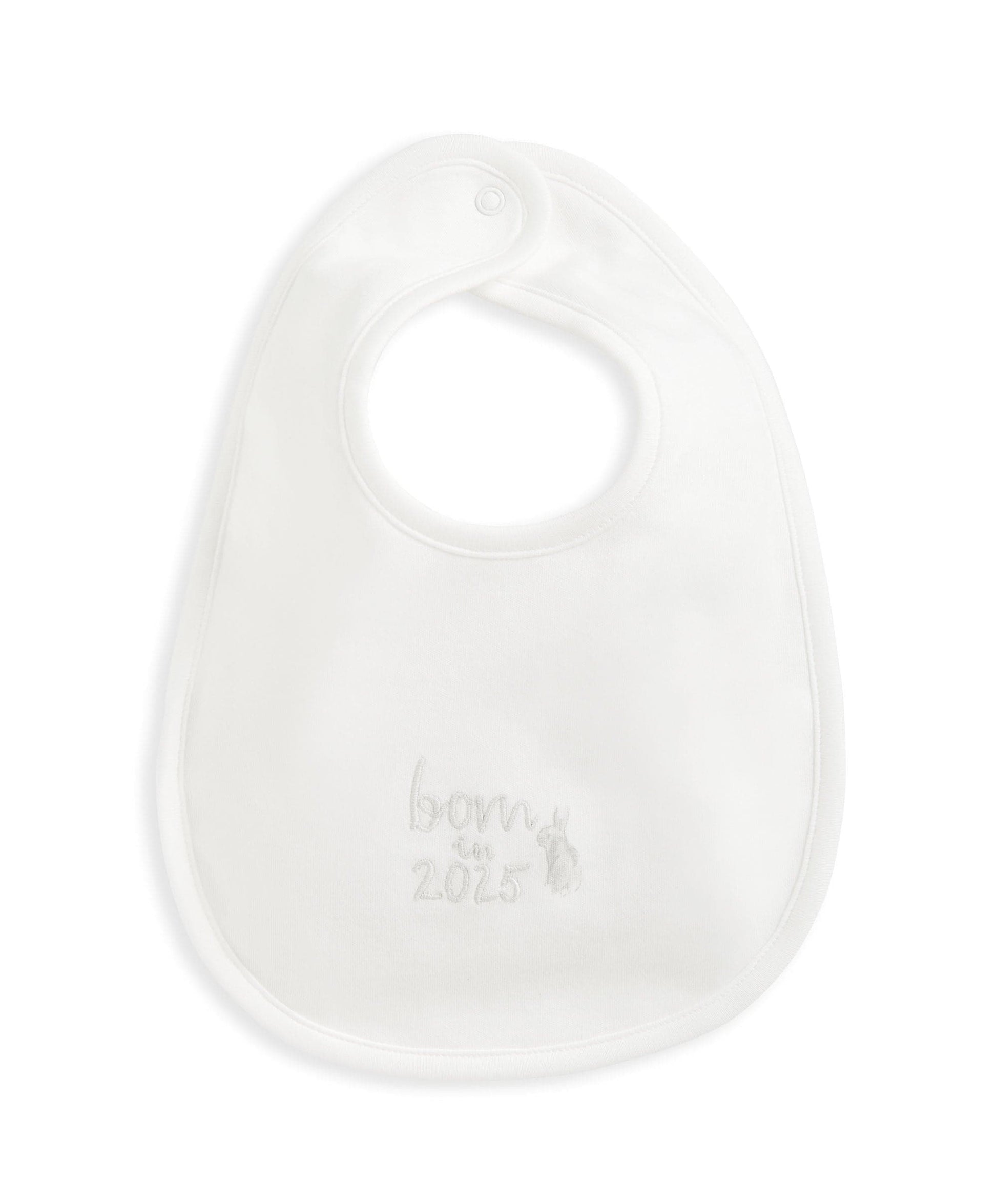 Adjustable bib with 'Born in 2025' embroidery and ring popper fastening.