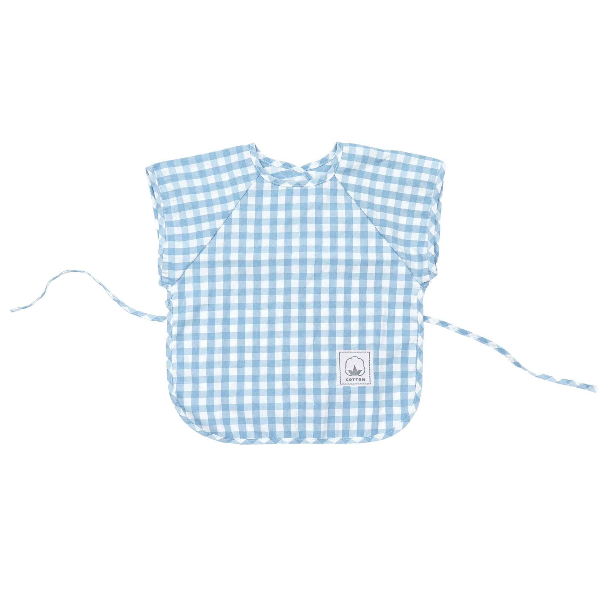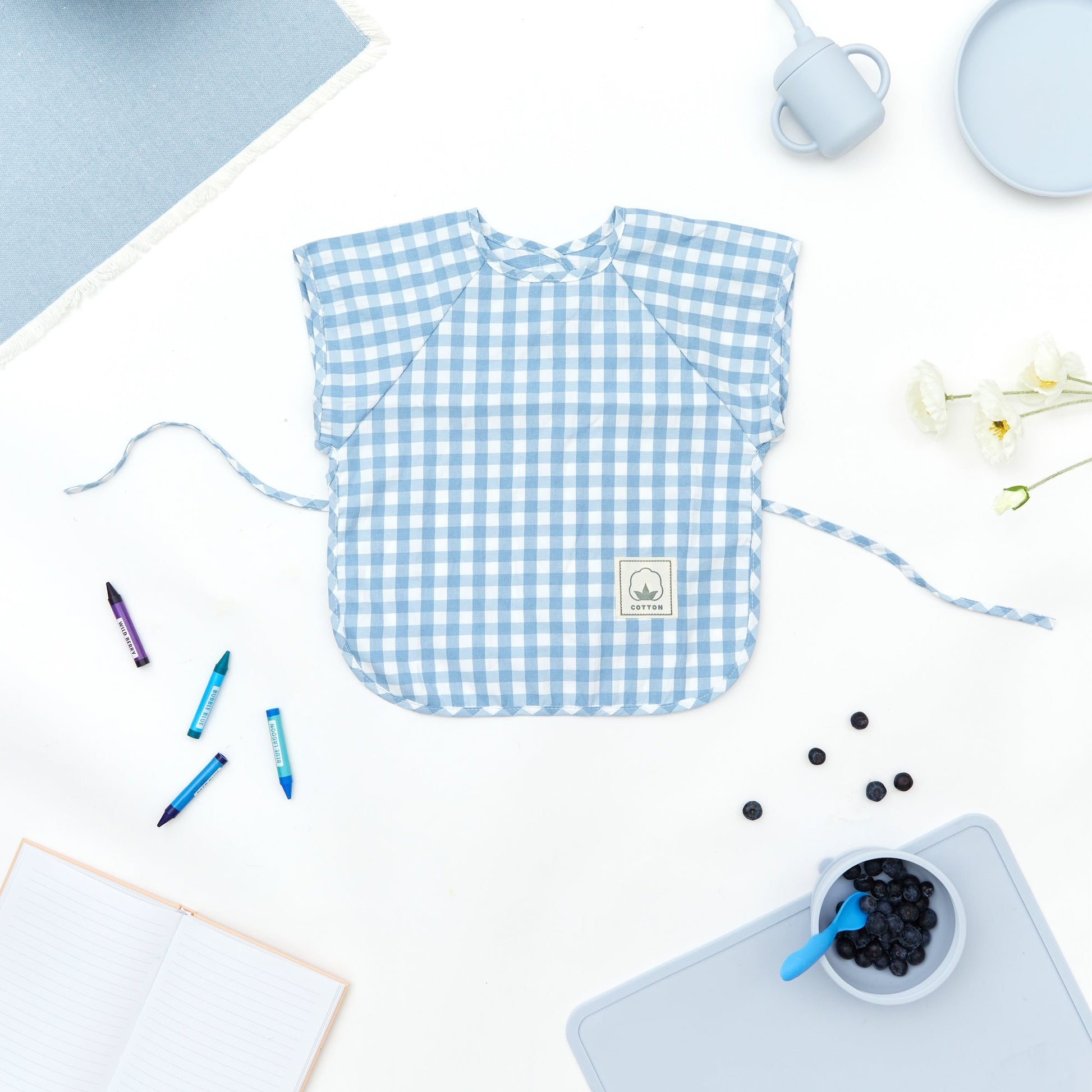 Bring a breath of fresh air to mealtime with our classic gingham style short-sleeve baby smock in sky blue. Made from soft cotton and featuring a waterproof inner shell, this beautiful gingham check print smock offers a perfect blend of serenity and practicality for your little one. Ideal for keeping clothes clean during mealtimes and playtime.