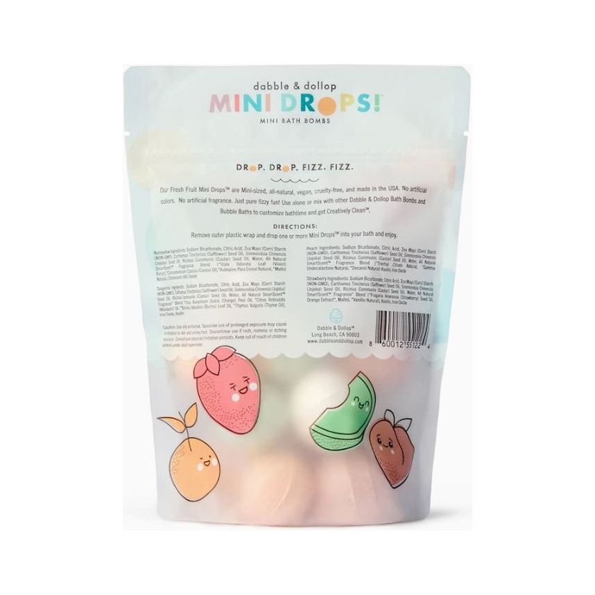 Dabble & Dollop Mini Drops take bath bombs for kids to the next level—a 100% natural, clean & safe way to make bath time fun and encourage creativity. Set includes 12 bath bombs in four fresh-smelling, all-natural scents: 3 Strawberry, 3 Tangerine, 3 Honeydew, and 3 Peach. Each Droplet is “kid-sized” at 1 inch, making them perfect for a gentle, moisturizing, sweetly scented bath experience.