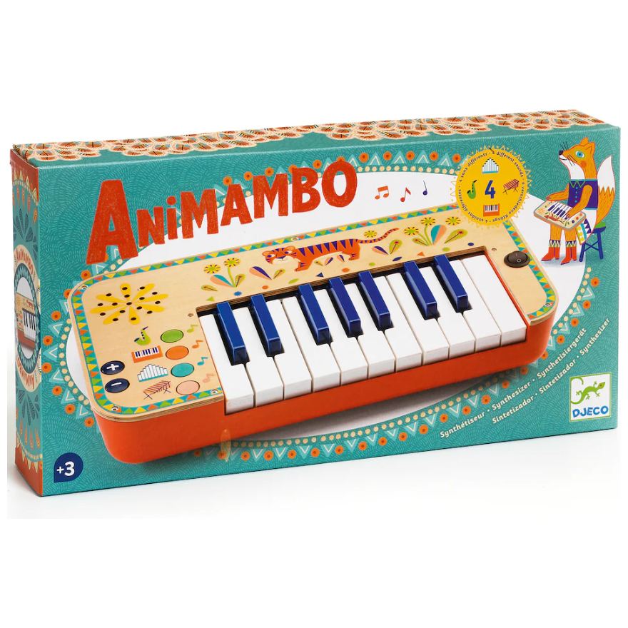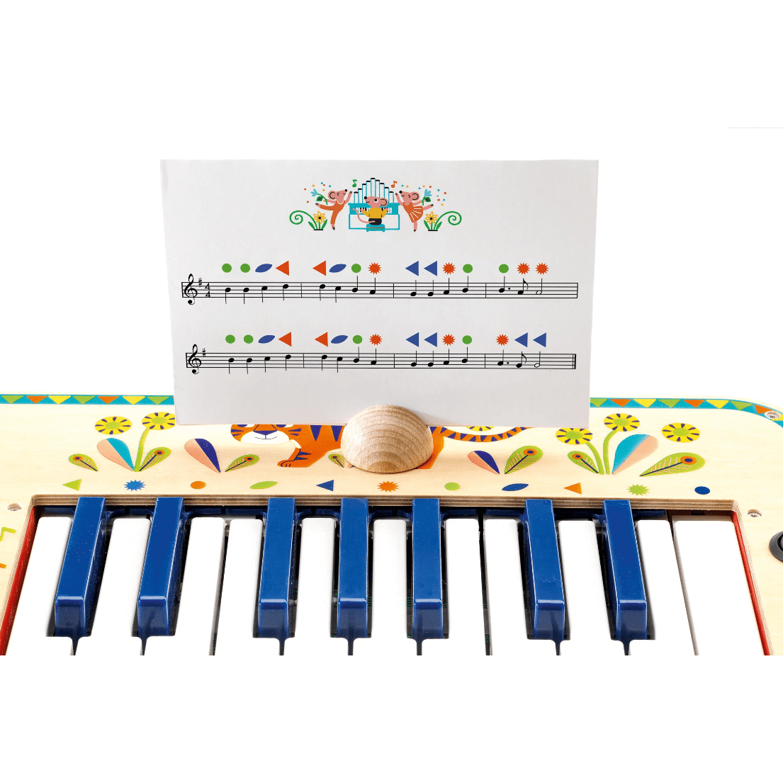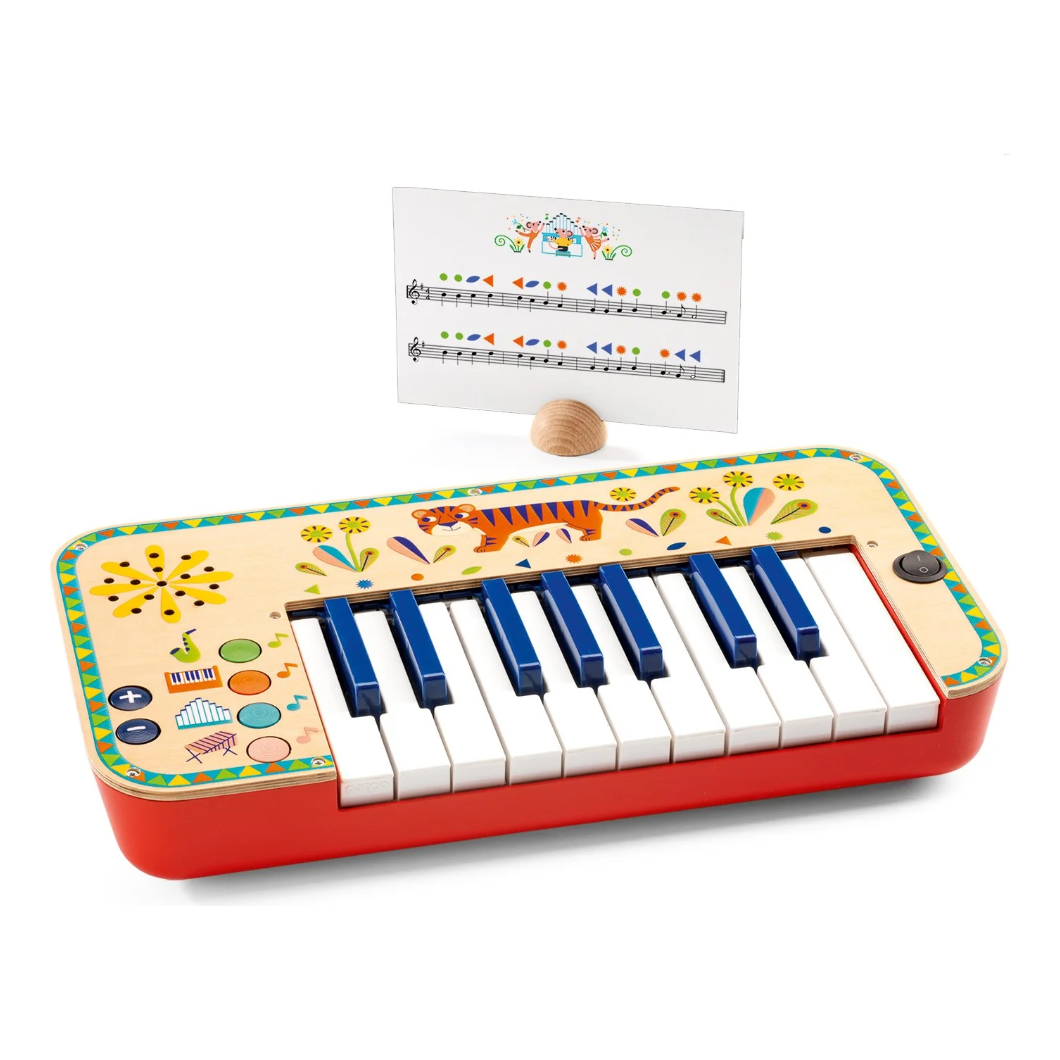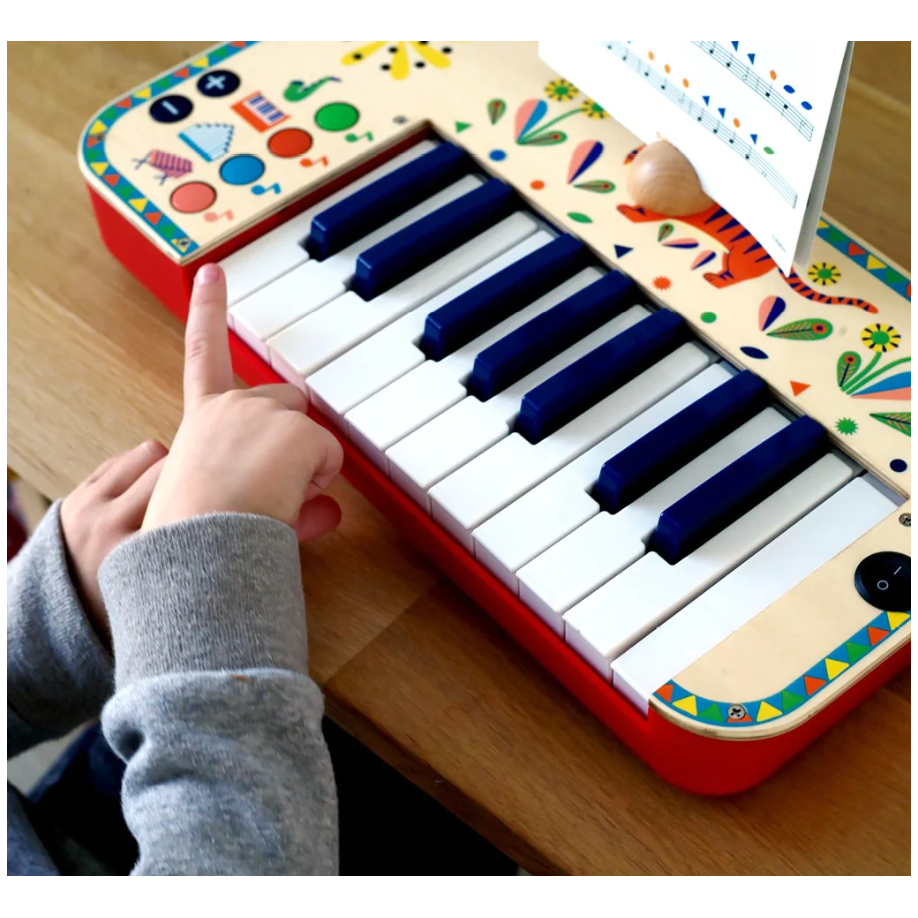 Possibly the most beautiful children's electric keyboard piano, with beautiful and engaging artwork designed by famous French artist Magali Antiogbe, This battery-operated piano plays 4 classic kids' songs; or play it yourself, each color-coded key plays a specific note (4 AA batteries, not included)
