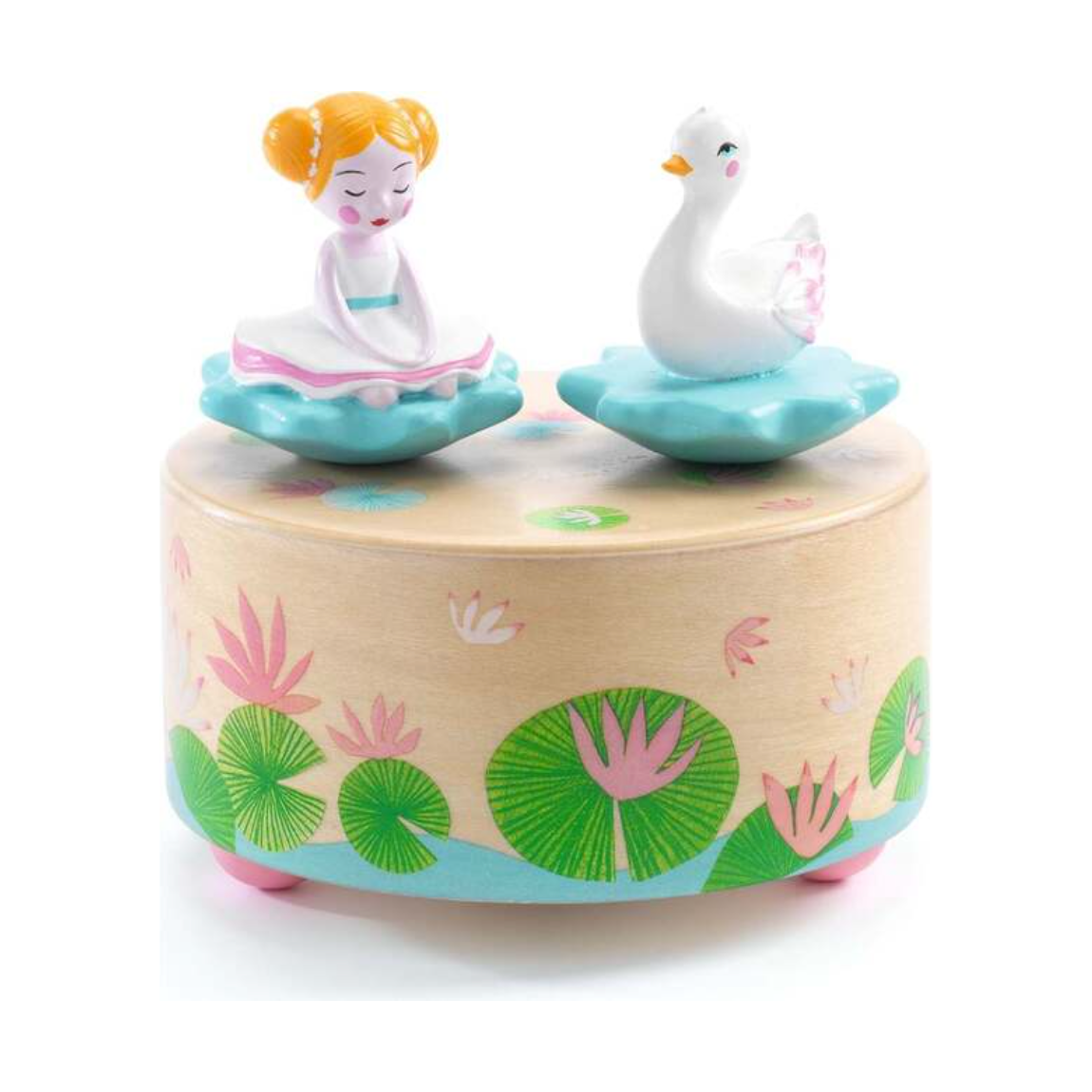Ballerina Melody is a round magnetic music box decorated with two ballerina and swan figurines. All you have to do is turn the key, and the figures begin to spin and dance to Swan Lake by Pyotr Ilyich Tchaikovsky. Song lasts approximately 2 minutes 30 seconds. A gorgeous decorative piece for a child's bedroom. Contents: a wooden music box and 2 plastic figurines. Measurements: 6.2 x 6.2 x 4.4 Design by: Elodie Nouhen, France Recommended for ages 12 months +