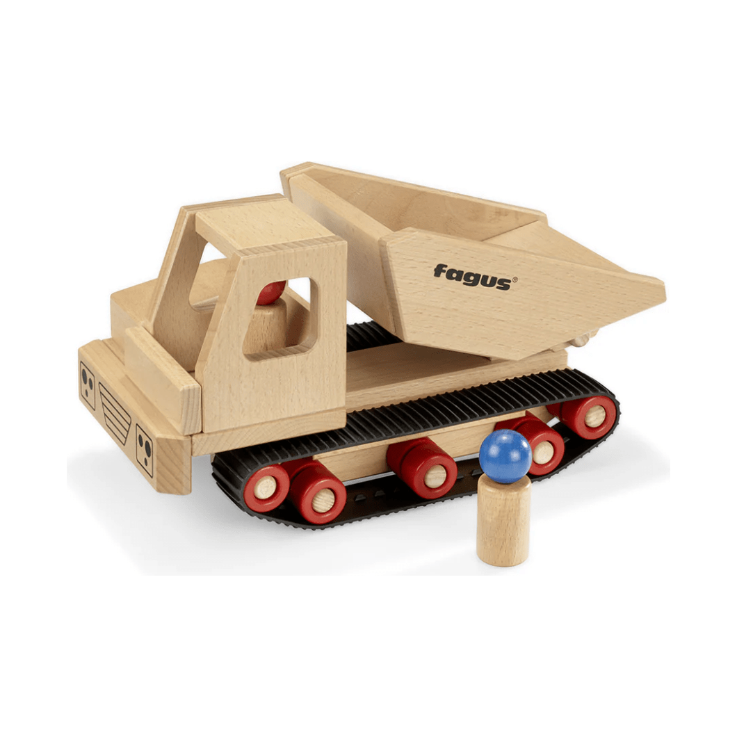 A dumper truck on caterpillar tracks, new for 2024. This truck has a tippable dump bed and two peg figures. The wonderful wooden cars and trucks by Fagus are made of beech wood (the Latin word fagus=beech) in a workshop for the handicapped. The fagus wooden toys are made without nails, screws or staples, and are interlocked, doweled and glued together.