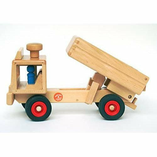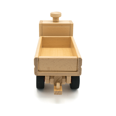 A steerable dump truck by Fagus, with two peg figures. The bed of the dump truck may be raised to dump a load of dirt, and then lowered to be filled with a new load. A hitch at the truck's back end allows a trailer to be attached for extra large loads.
