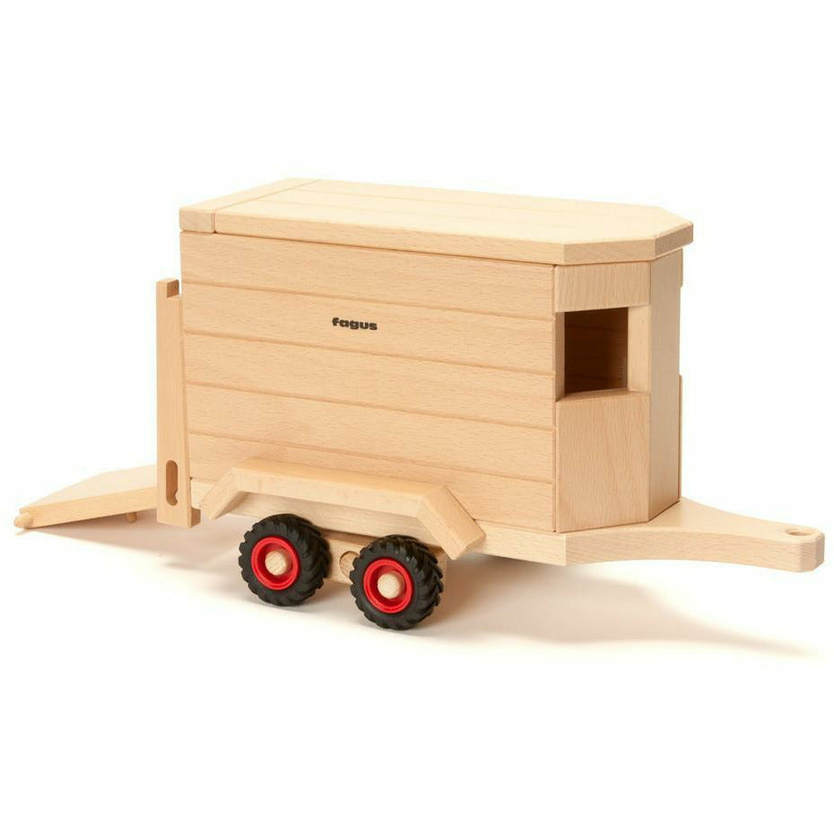This wooden toy trailer from the German company Fagus is sure to be a big hit with your little farmer. Made from solid wood, the sturdy roof can be removed for an aerial view of the horses or other animals. There is a ramp to help load and unload the passengers. The Horse Trailer can be hitched to either the tractor or to the unimog.