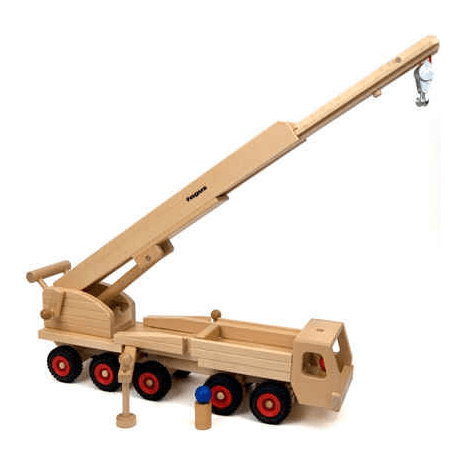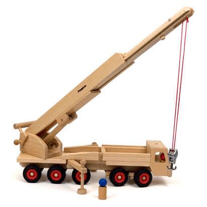 The arm of this mobile crane swivels and extends to an impressive length of 33 inches and may be adjusted to a number of heights and angles. The double hook can hold the lifting fork or load magnet (each sold separately) or hook onto other objects to lift and load your cargo. Two supports swing from the side of the wooden truck to add stability when the crane is in use--just like a real constructio crane! This truck is very easy to steer: just push in the direction you wish to go, and the truck will follow your hand movement! The perfect addition to your building site, and a great truck for the older child. 2 figures included.