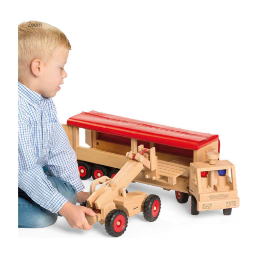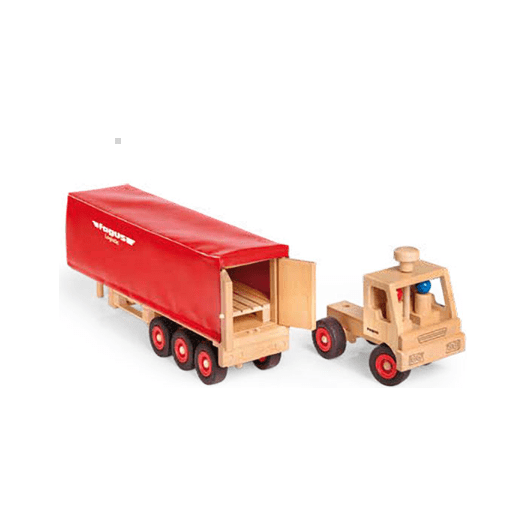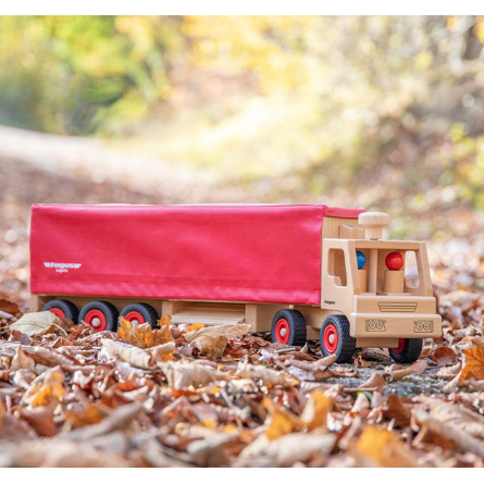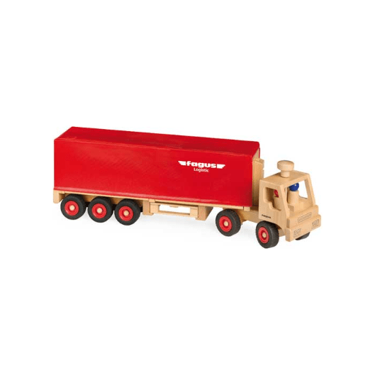 The Fagus Semi Trailer is one of the stars of Fagus' wooden toy range. Its clever design lets your child load and unload this stunning truck from both sides and the back by folding up the cover, folding down the tailgates on the side and opening up the doors in the back of the Fagus Semi Trailer. The red cover is attached to the Fagus Semi Trailer by the means of velcro and can be folded or completely taken off. The Fagus Semi Trailer has plenty of space for different types of cargo and is the perfect play companion for all children that like to move their treasures in a safe and secure way. The best friend of the Fagus Semi Trailer is the Fagus Forklift. This fantastic team of two makes sure all wares and cargo are safely distributed from place to another and warehouses, supermarkets and shopping centres are stocked quickly without delay.