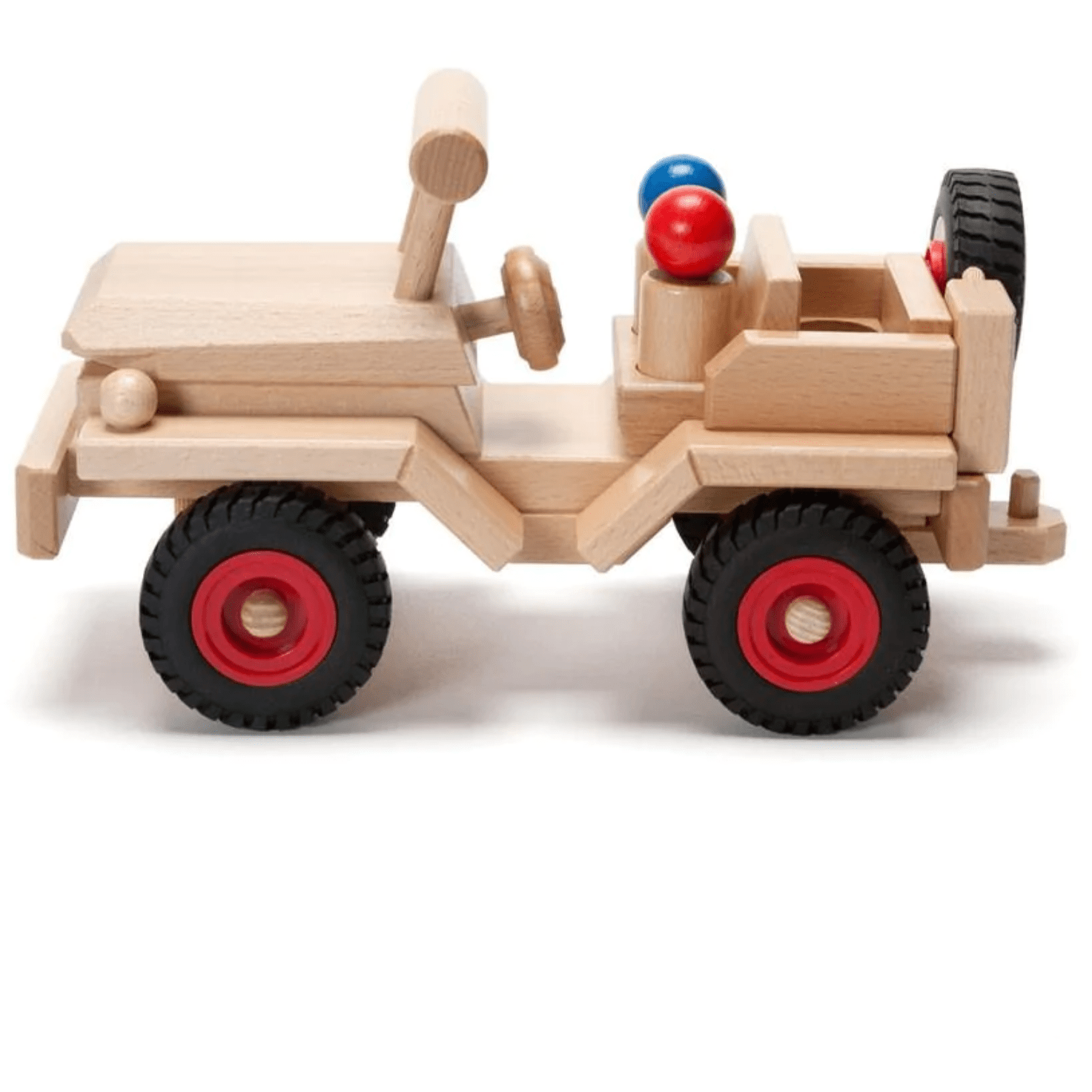 Adventure awaits! The Fagus Jeep is the perfect companion for your child's next small world adventure trip. Whether it's a camping trip, a bumpy cross-country drive or just a fun day helping out on the farm, the Fagus Jeep is easily steerable, sports grippy red and black rubber wheels and comes with two Fagus Figures as well as a removable fuel can and a spare wheel just like a real jeep. For more fun and imaginative play, combine the Fagus Jeep with any Fagus trailer with a tow bar.