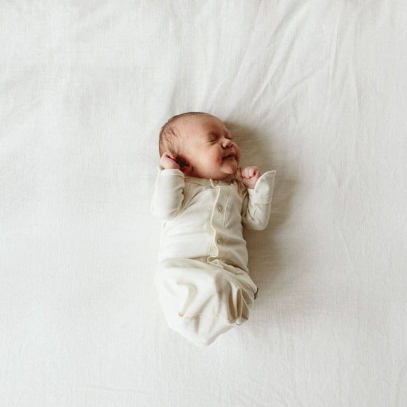 The best organic sleeper for diaper changes complete with built-in mitts, one-snap foot pocket, and SUPER soft, breathable fabric. Converts with a flip, with our patent-pending bottom pocket, quickly change from gown to sleeper and makes diaper changes a snap.