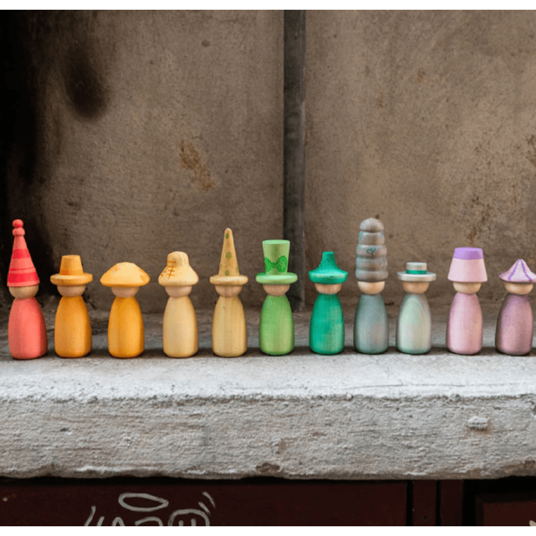 The set contains 12 Nins hand-stained in Grapat's 12 signature colours of the rainbow with interchangeable hats and bodies to bring even more combinations of colourful possibilities to every open-ended play activity.