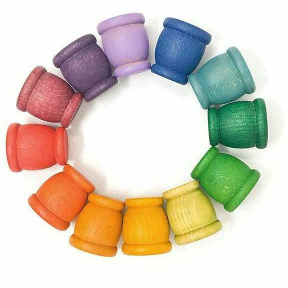 The 12 "mates" painted in 12 rainbow colors can be a perfect complement to the other Grapat stacking and matching toys. Children can use them to learn colors, for matching and sorting, or just as a backdrop for play!
