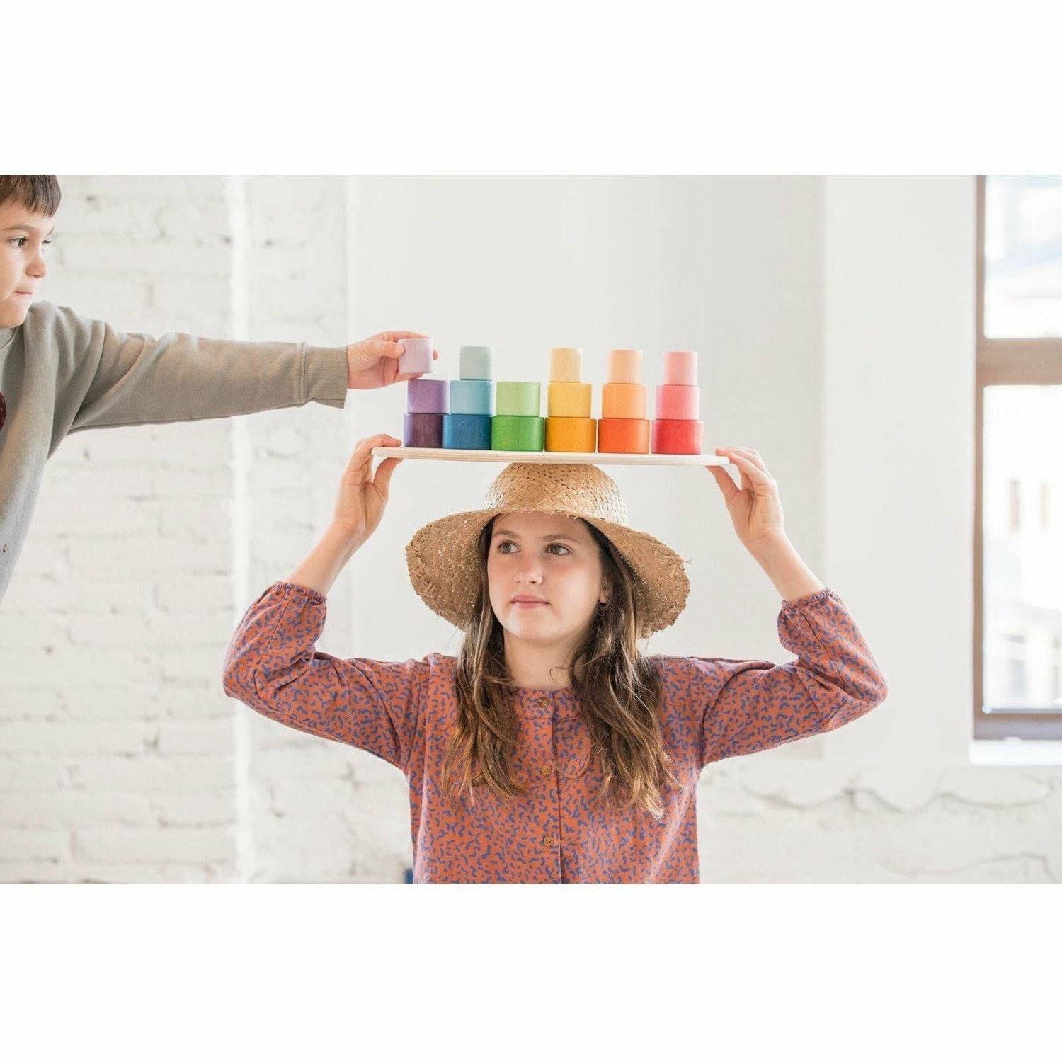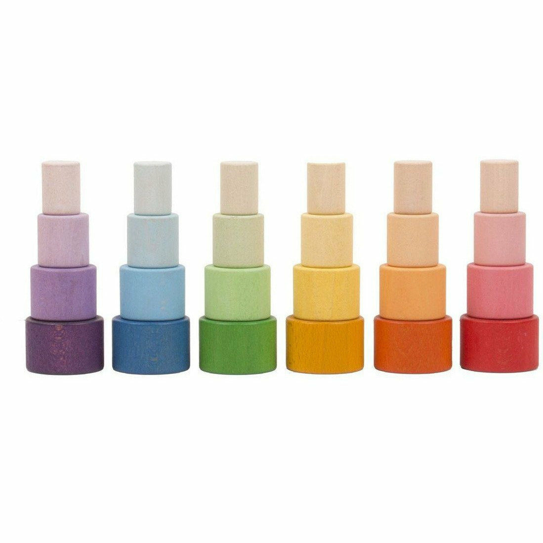 Wood Nest Rainbow Bowls 24 pcs include 6 colours of the following bowls: 7.2 cm in diameter with a height of 3.8 cm, 5.8 cm in diamter with a height of 3.8 cm, 4.4 cm in diameter with a height of 3.8 cm and 3 cm in diameter with a height of 3.8 cm.
