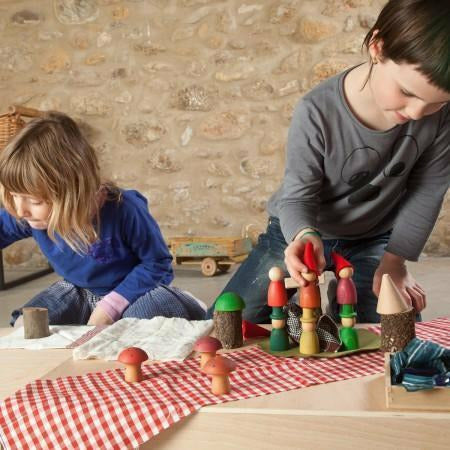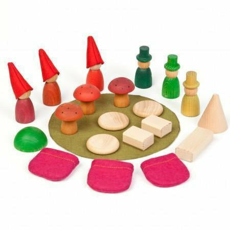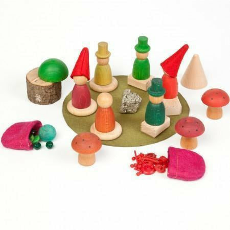 The Nins in the Woods storytelling set offers hours of playing and storytelling fun. This set comes with 6 Nins peg people (3 in top hats and 3 with felt hats), 3 mushrooms, 3 felt sacks, 1 felt circle, 3 disks, 1 cone, 2 little and one large block, and one semisphere. What tales can you tell of these little people?
