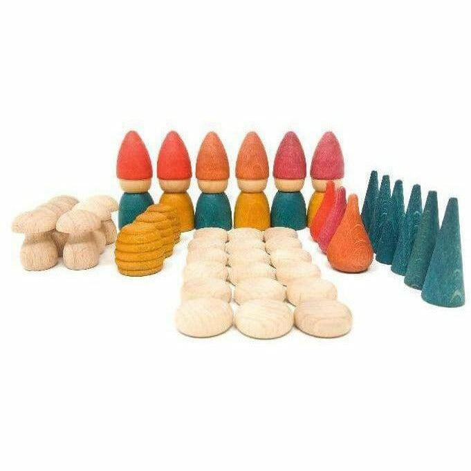 The Grapat Nins Tomten set contains: 6 Nins® Tomtens, 18 coins, 6 cones, 3 honey comb, 3 fires, 6 mushrooms.