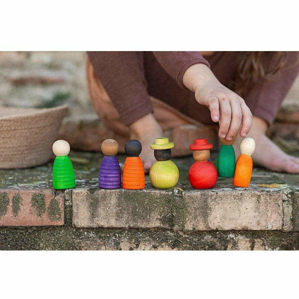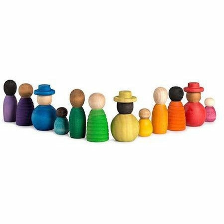 12 Nins in 3 skin tones: 3 narrow Nins, 3 wide Nins, 3 striped Nins, 3 Baby Nins, includes a fabric bag. They don’t have eyes, or a gender. This way, it’s the children who can develop their own stories and it’s them who decide which character they are going to play.