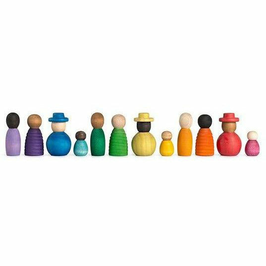 12 Nins in 3 skin tones: 3 narrow Nins, 3 wide Nins, 3 striped Nins, 3 Baby Nins, includes a fabric bag. They don’t have eyes, or a gender. This way, it’s the children who can develop their own stories and it’s them who decide which character they are going to play.