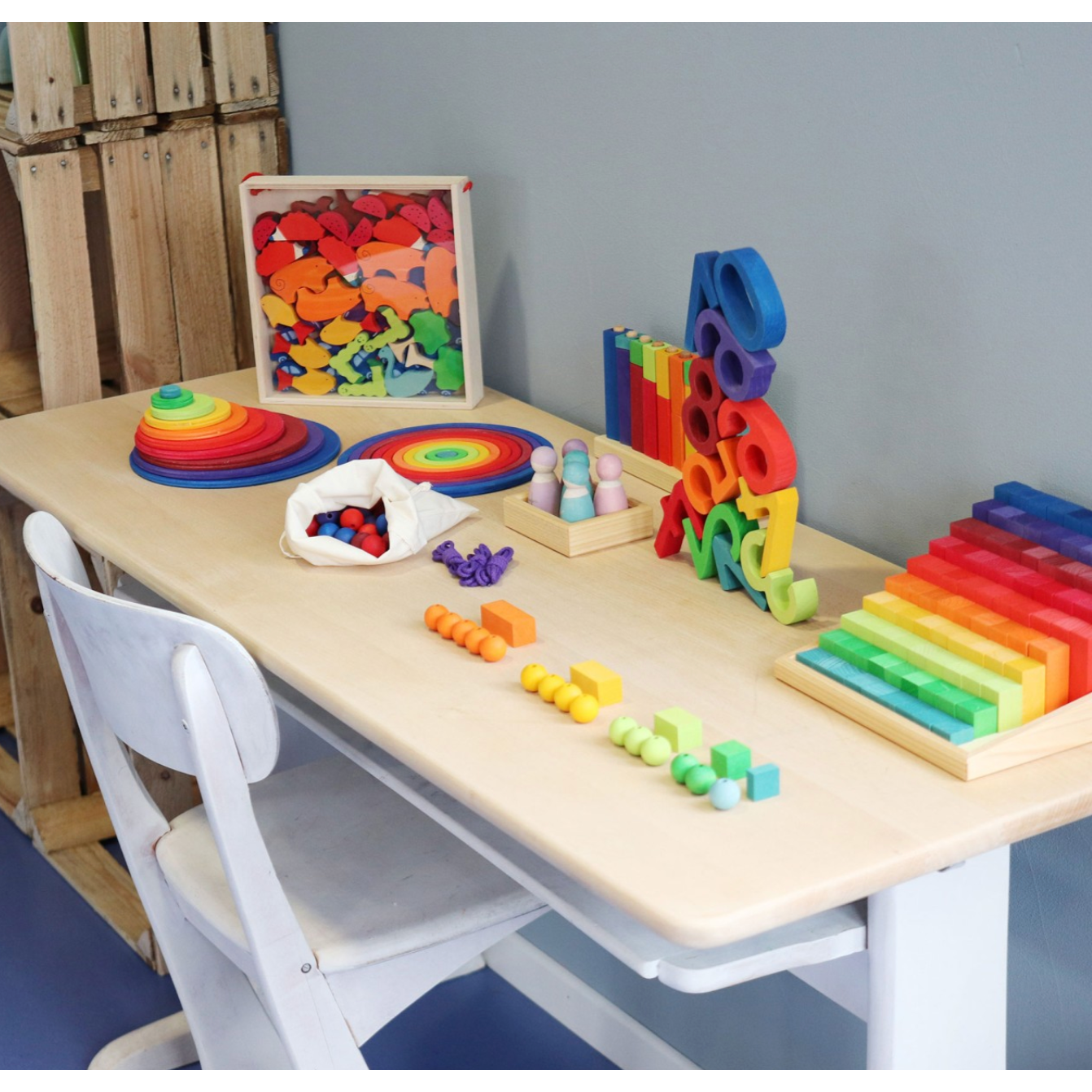 Counting Stack Game, includes ideas for playing. An exciting way for children to discover the world of numbers. Each number can be counted by feeling with the hands. Fits perfectly with Grimm's Stepped Counting Blocks, Building Set Numbers, Figures for Counting and Story Telling, Bead Stairs and Grimm's 5 Math Friends.