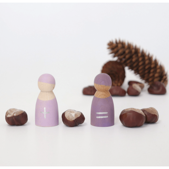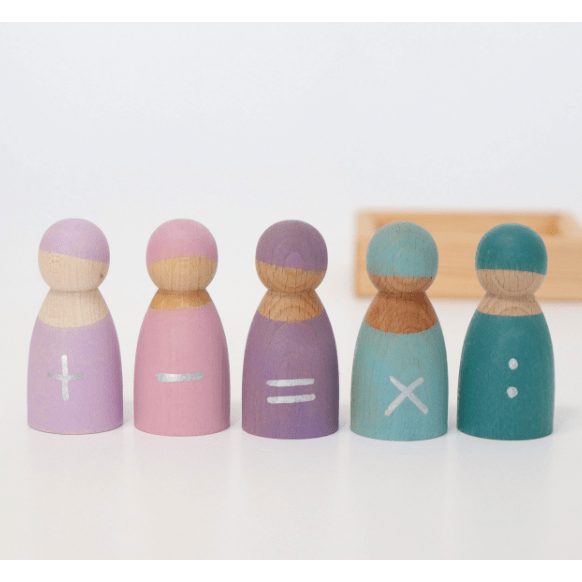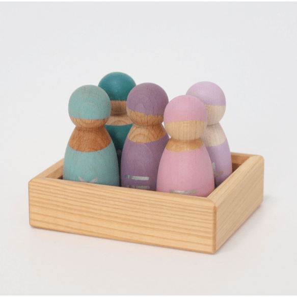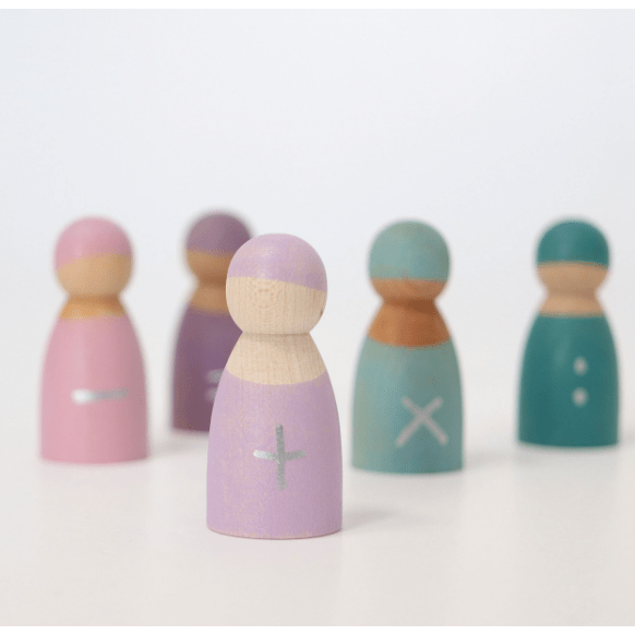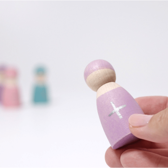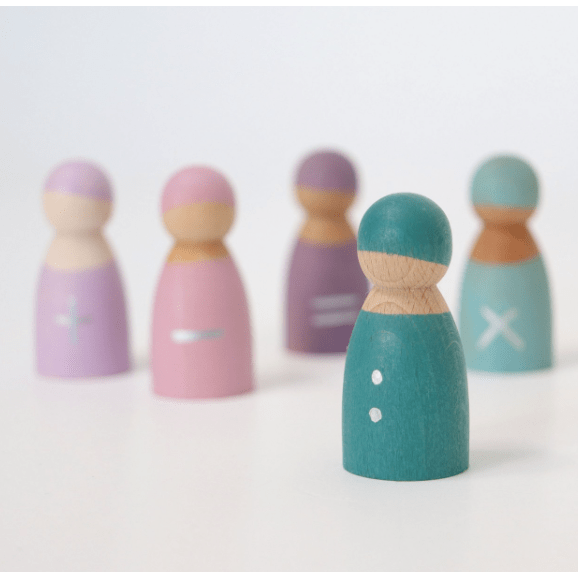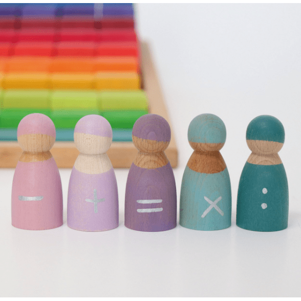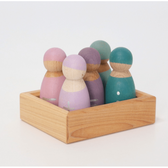 Seven Friends in 7 bowls: Sorting and matching peg dolls in wooden frame (for each day). Tip: You can style the peg dolls with cloth or tape. Each hand-painted peg doll is unique! Combine with other Grimm's products for even more fun as shown here with the Small Rainbow.