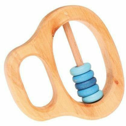 Rattle or teething ring with five wooden discs. Available with red or blue rings