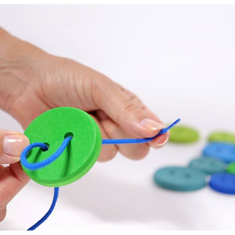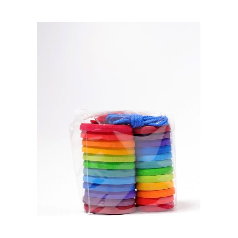24 pieces in rainbow colours (12 small buttons and 12 large buttons) + 2 cords for threading.