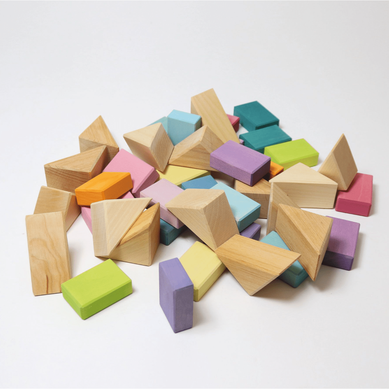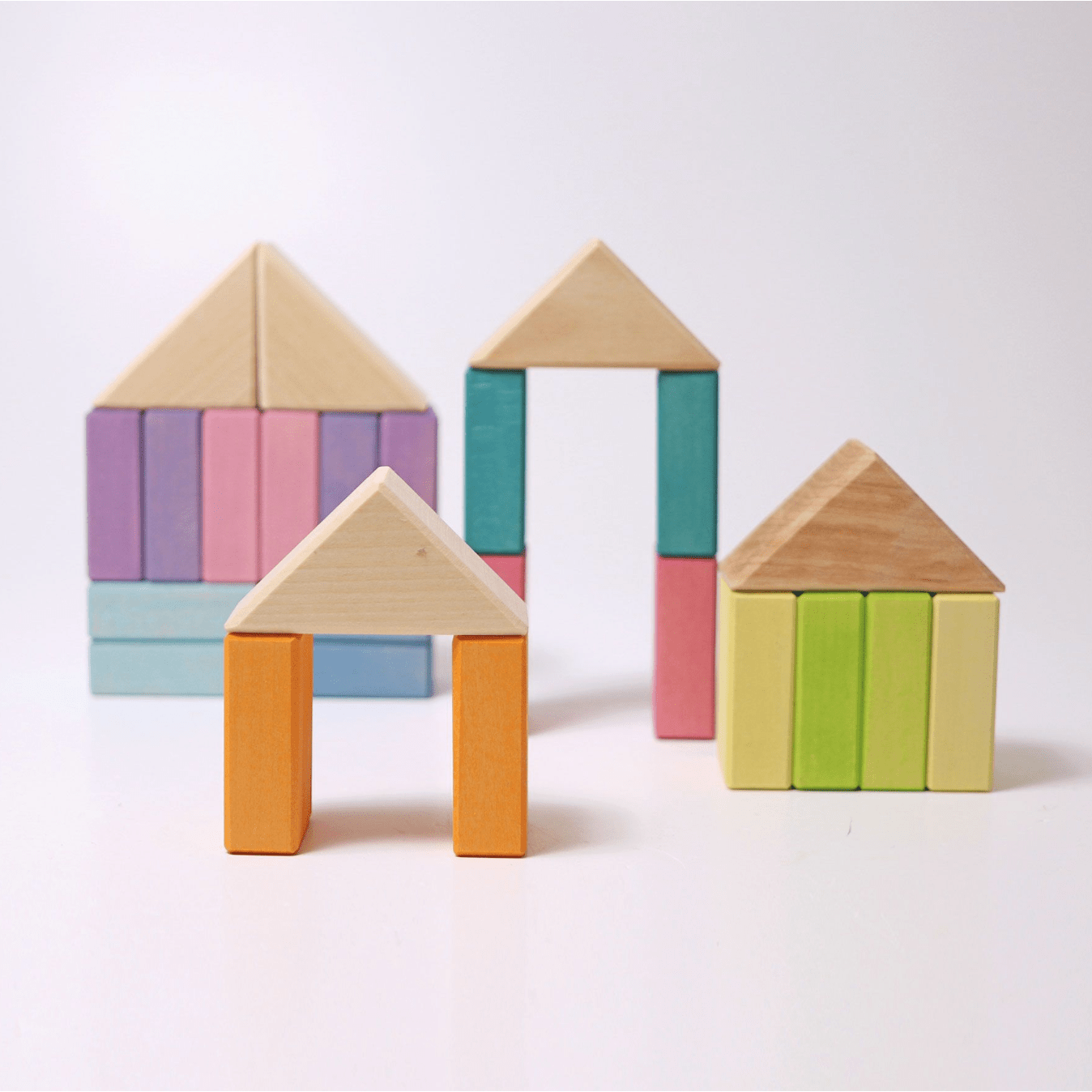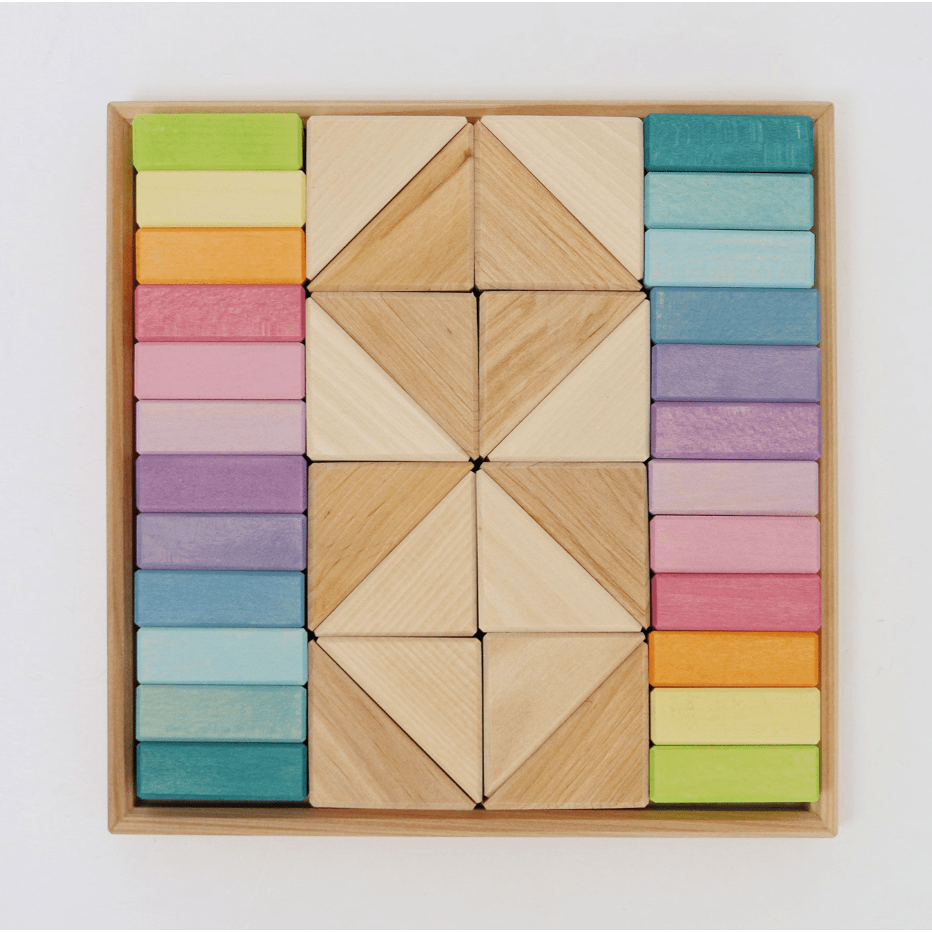 The Pastel Duo provides beautiful building material - and everything in duplicate: two different basic geometric shapes, two color worlds, two types of wood and two building blocks per pastel color. The contrasts of the natural-colored triangles and the pastel-colored rectangles harmonize wonderfully. Thus, the Pastel Duo not only perfectly complements the building materials of our pastel series, but also invites you to sort by colors and shapes and discover countless other play possibilities.