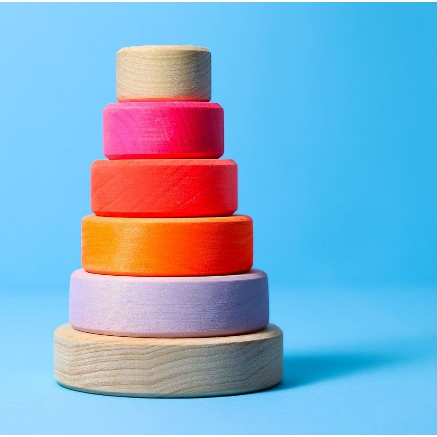 Is this art ... or can you play with it? Well, both! The Small Conical Tower is a must-have in the toddler's room. But of course, it can also be artistic! After all, children have a very keen sense of color and harmony. And the adults are happy when the toy is appealing to the eye and enriches the home as an attractive ornament. So it's a win-win for young and old! The Small Conical Tower invites sorting by colors and sizes, stacking, and creative building. Playing with it trains the motor skills of the little ones and creates joy by combining bright colors with natural wood tones. 5 discs for stacking Materials: lime wood, non-toxic water-based colour stain