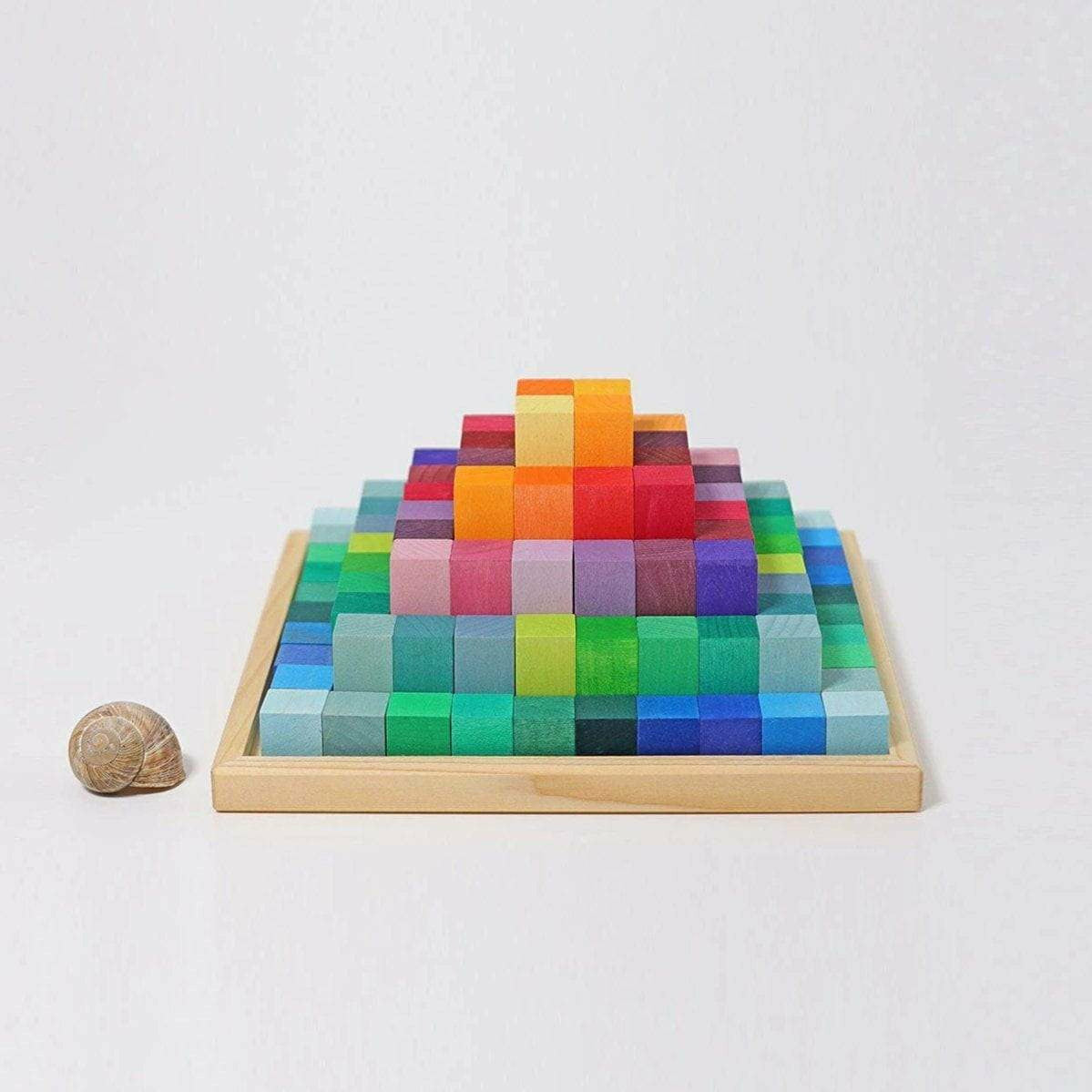 An exciting way for children to discover the world of numbers and learn the colour sequence of the rainbow! Through tactile touch, each number can be counted by feeling with the hands. Make the size of the numbers visible: Two small turquoise blocks are as high as one dark green block, and two dark green blocks are as high as one yellow block, and so on. There are several additional products which complement the Stepped Counting Blocks. You will find them in the category Play and Learn > Easy Counting. 100 blocks in a wooden frame. Materials: lime wood, non-toxic water based color stain/non-toxic plant based oil finish. Size: frame length 22,5cm, single blocks 2cm thickness, blocks 1-10cm.