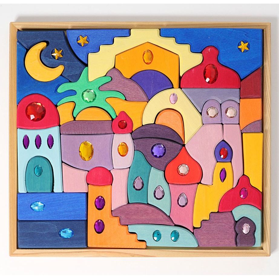 With the orient inspired and organic shapes of this set, sparkling scenes, cities and landscapes can be built. The unique variety of shapes inspires children to build new play scenes every time. This building set is a perfect complement to our Landscape Puzzle and Small Four Elements Building Set. These smaller building sets are well suited for table top play, where wonderful structures can arise or different marble games can be imagined.