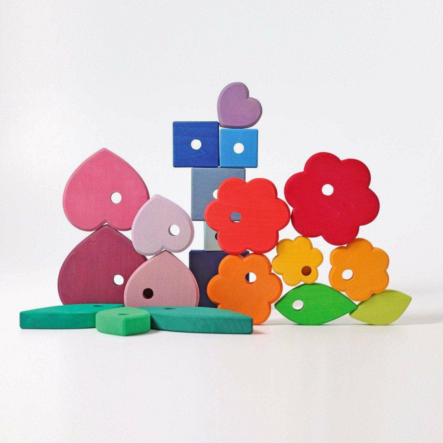 Leaf, flower, heart and square: the children can sort and stack forms and colours and build with the discs. While stacking, the eye-hand coordination is stimulated and fine motor skills are trained.
