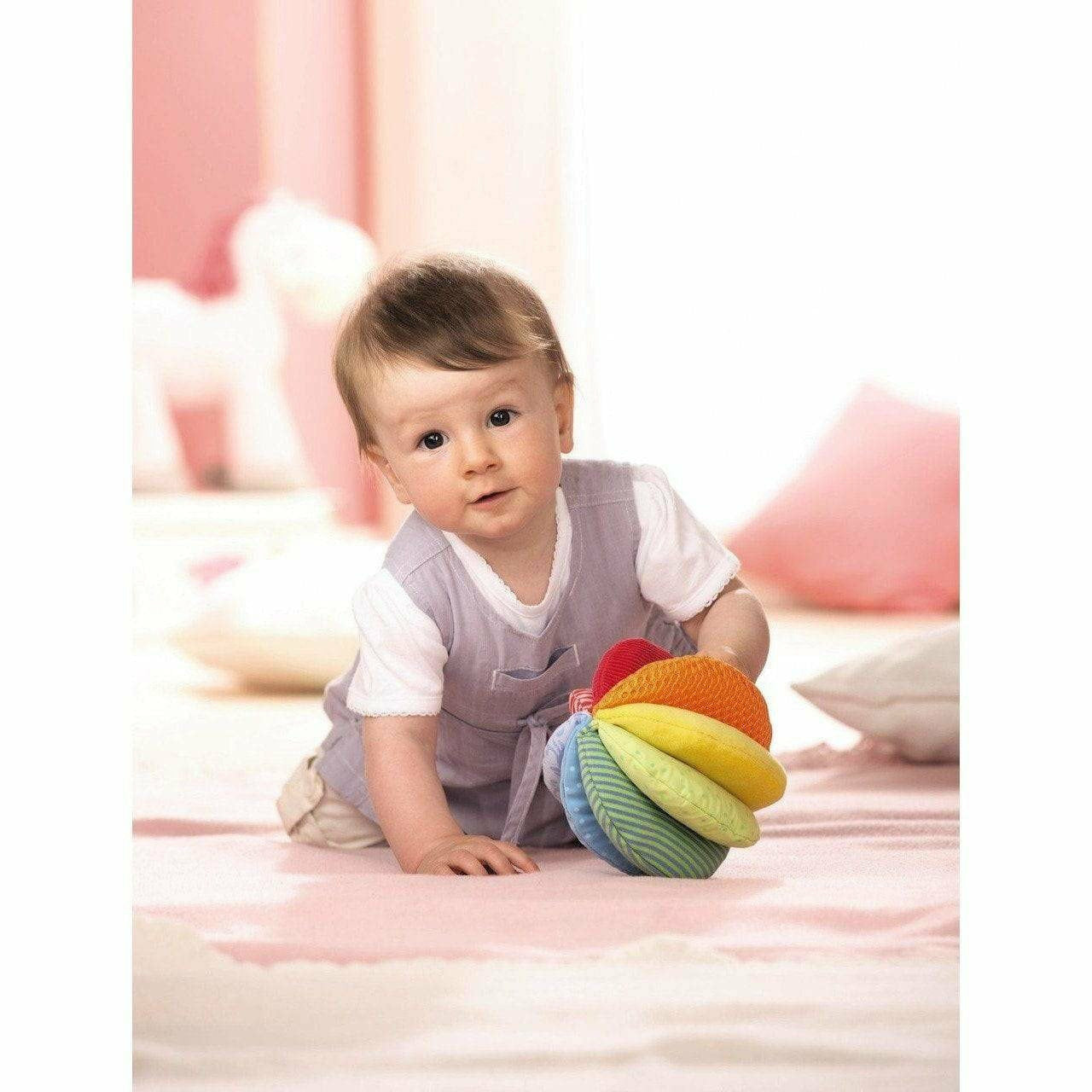 Crinkles, textures and rattles too! Just the right amount of age-appropriate stimulation for your baby's development. Eight colorful fabric sections offer different textures, sounds, visual and auditory feedback: rough, smooth, ridges, solids, stripes, rustle, rattle, squeak, and more! Even the youngest babies love the rattling noise it makes when tossed in the air or rolled on the ground.