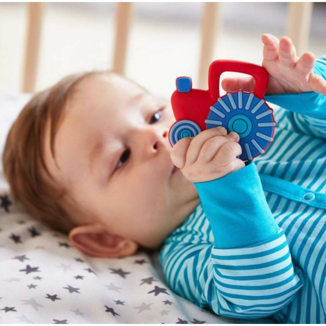 The tractor is a useful aid for teething babies. Chewing on its different surfaces provides plenty of variety and induces relaxation. Babies can also grasp the toy well with their hands.