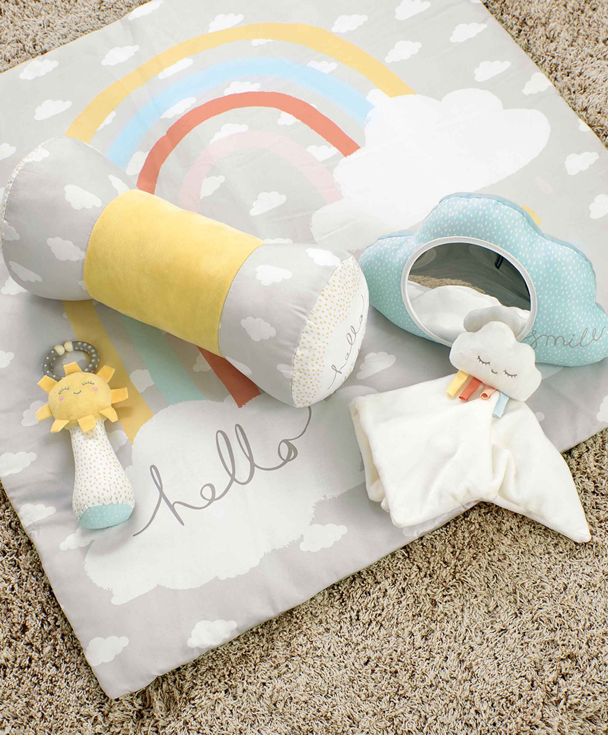 Put a smile on your little one's face with our Happy Cloud Playmat Bundle. With a bright and colourful padded mat, your baby will be super-comfy when it comes to playtime. With 8 fun features that'll help their development and stimulate their senses, including a tummy time roll, 4 vibrant hanging toys, a separate rattle and comforter, and a shiny mirror cloud - ideal for perfecting those reaching and grabbing skills.