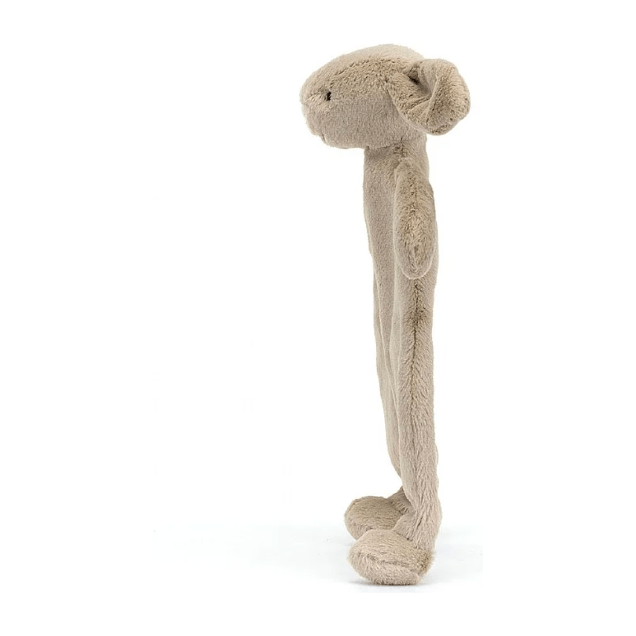 Irresistibly soft in a mushroom coloured fur made from recycled fibres, Bashful Beige Bunny Comforter features our beloved Bashful Bunny signature long lop ears, a pink suedette nose and embroidered eyes. Designed with an un-stuffed body yet delicately squashy paws and bobble feet, making it easy for little hands to grab hold of and comfort themselves.