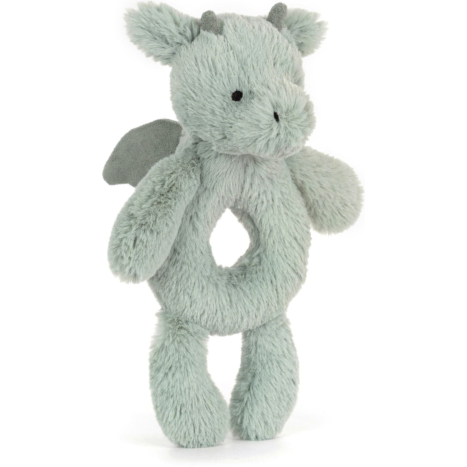 Keep Baby giggling throughout any quest with this soft, moss-green treat! The Bashful Dragon Ring Rattle has been crafted in recycled fibres and features cute ears, stitched eyes and suedette horns and wings. The ring-shaped tummy is easy for little hands to grab and the gentle rattle delights at every shake.Β