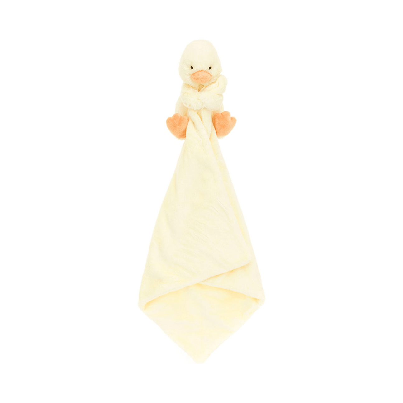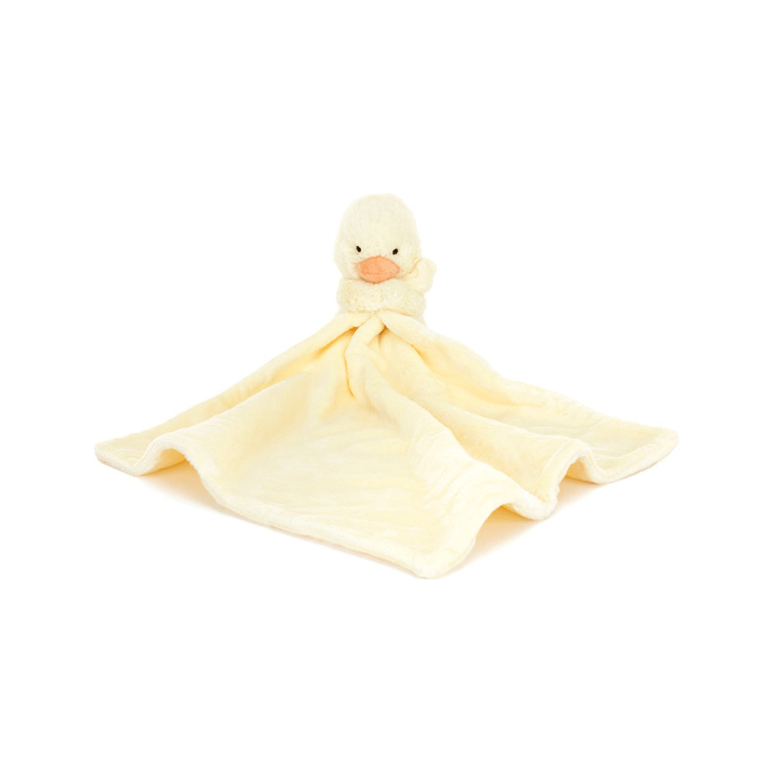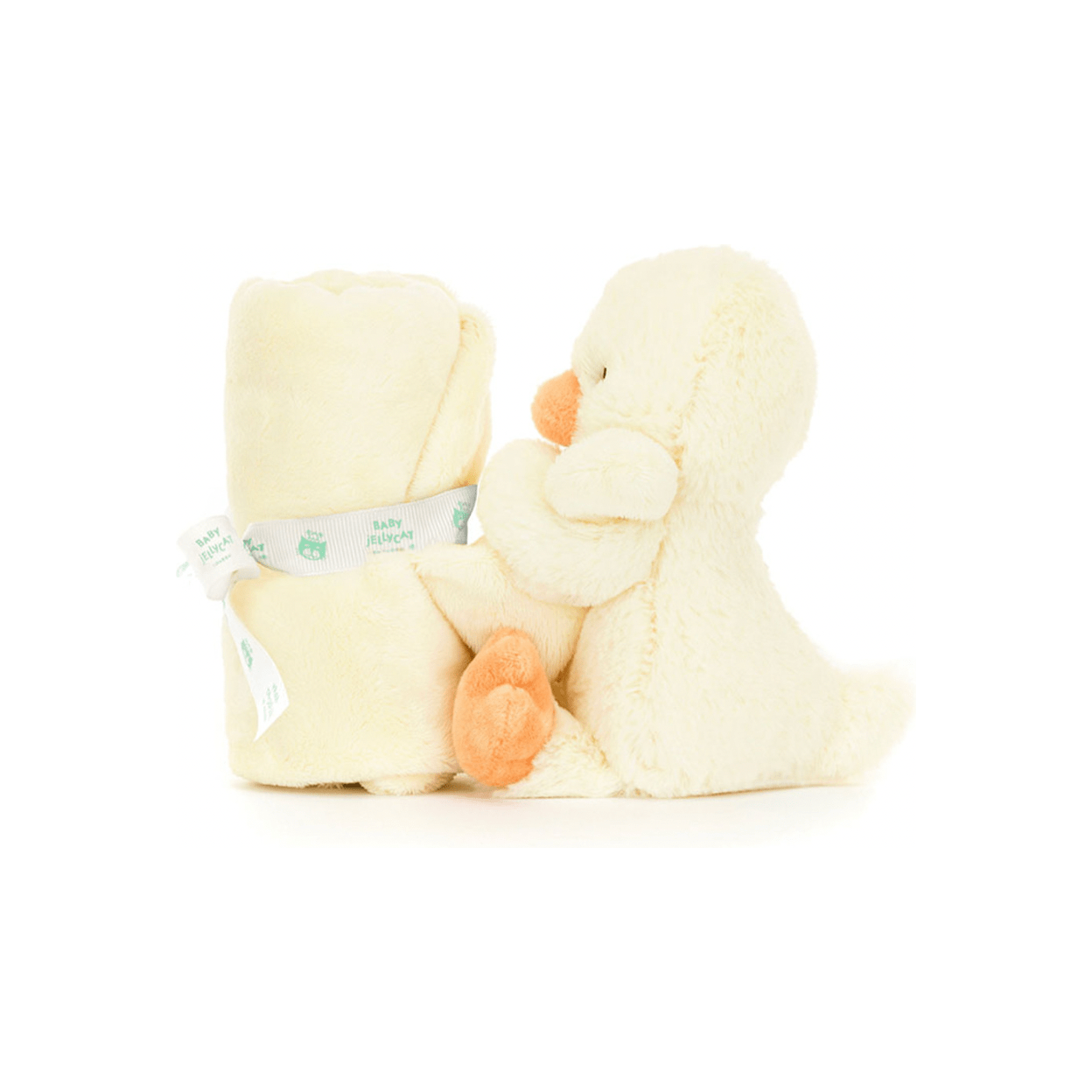 Sweet, gentle Bashful Duckling Soother is a perfect newborn gift, rolled up and presented in a Baby Jellycat grosgrain ribbon. Featuring our most loved farmyard friend, soft in a pale yellow fur made from recycled fibers and holding on tight to a smooth, un-stuffed square shaped soother; a simply gorgeous cuddle companion.