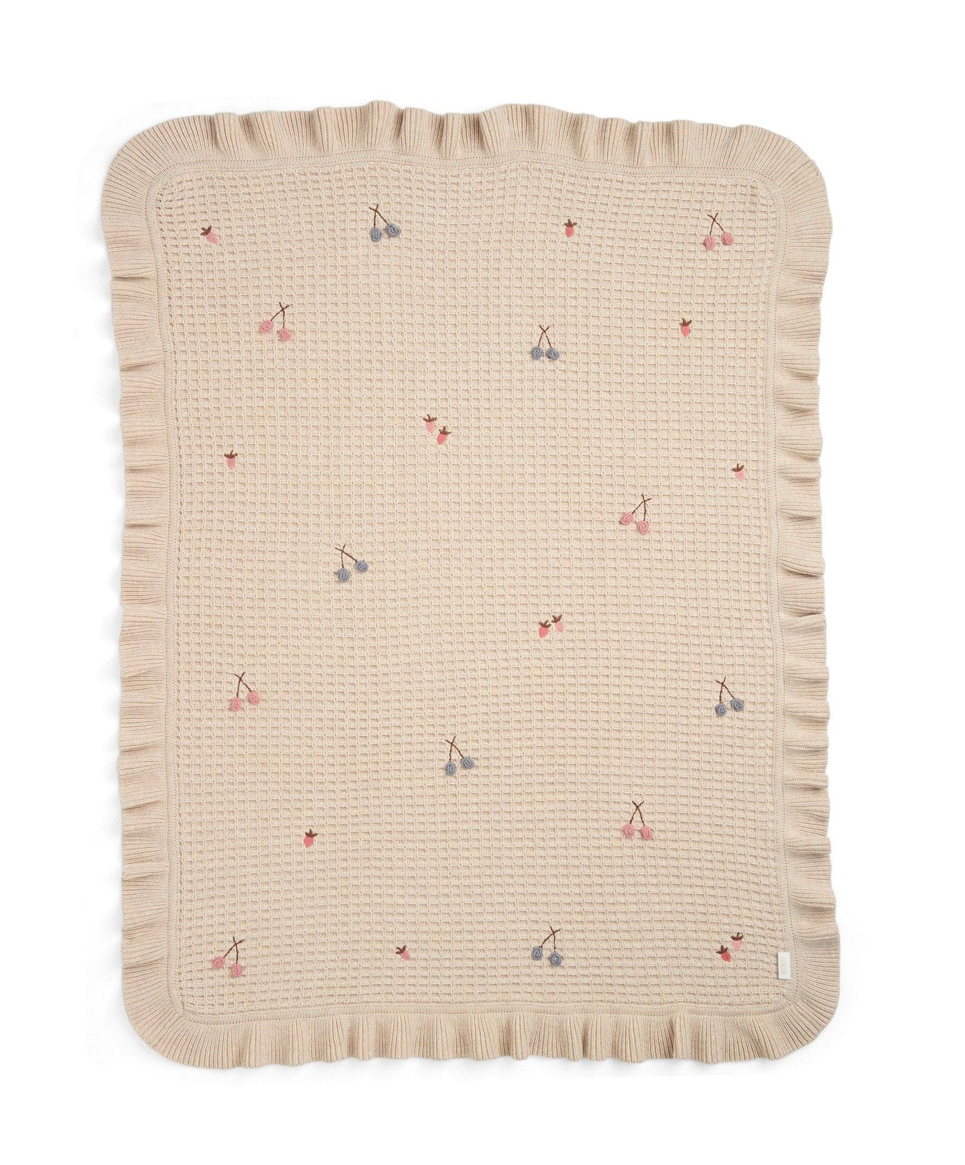 Lightweight, waffle-effect knitted cotton blanket. Featuring beautiful berry and flower bud embroidery detail and finished with a pretty frilled edge. Machine washable.